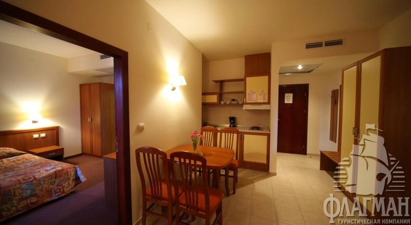 В курортном комплексе Золотые Пески, в 30 км от аэропорта города Варна, в центрe курорта и в 150 м от пляжа.