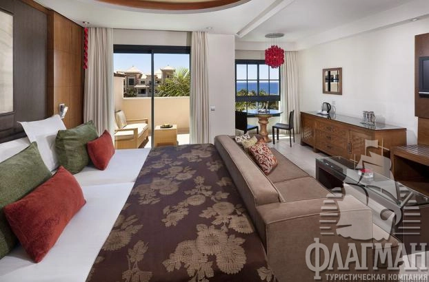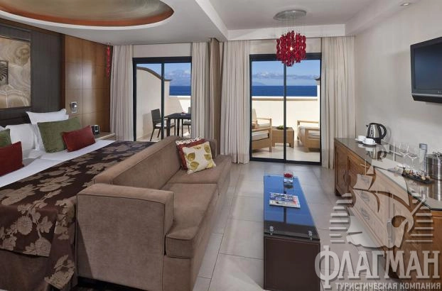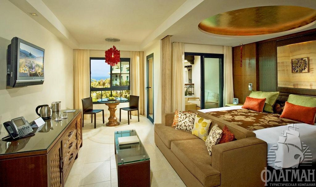 - 76 suite lateral sea view (частичным видом на океан, оборудование как в номерах junior suite, гостиная с диван-кроватью,гидромассажная ванна, обеденный стол, особая отделка номера, 2 ТВ, 68 м2, макс. 3 или 2+2 чел., из них часть Red Level for Families – дополнительно услуги Red Level for Families);