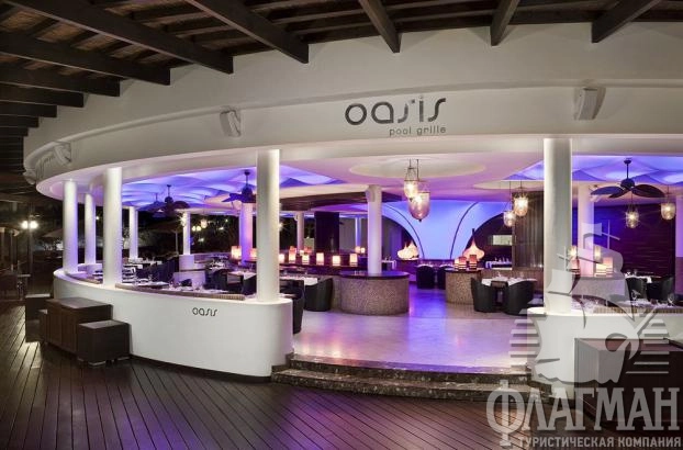 - a la carte ресторан Oasis Pool Grill (на 250 мест): блюда средиземноморской кухни (рис, мясо-гриль, рыба и морепродукты), а также выбор блюд по облегченному меню в течение дня; форма одежды: resort casual; время работы: с 11:00 до 19:00
