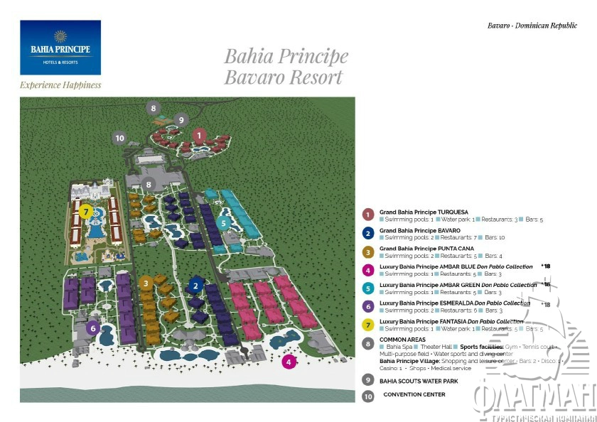 Гранд Бахия Принцип Баваро 5* расположен на огромной территории на берегу океана на песчаном пляже Playa Bavaro, где по соседству находятся ещё несколько отелей гостиничной сети Bahia: Grand Bahia Principe Turquesa 5*, Luxury Bahia Principe Esmeralda 5*, Luxury Bahia Principe Ambar 5* и Gran Bahia Principe Punta Cana 5*. Это комплекс зданий в колониальном стиле, расположенный на площади более 500 000 м2. Территория большая зелёная, вся покрыта пальмами и тропическими садами. В инфраструктуру входят несколько бассейнов, торгово-развлекательная зона Pueblo Principe с магазинами, сувенирными лавками и барами, зона вечерних развлечений с амфитеатром, казино, СПА-центр, зал для фитнеса и теннисные корты. В отеле работает несколько тематических ала-карт ресторанов. Дети оценят аквапарк Bahia Scouts Wahter Park. Активная анимационная команда не даёт скучать гостям в течении всего дня, а вечером можно посмотреть красочные шоу или испытать удачу в казино. Ценители респектабельных видов спорта, воспользуются полями для гольфа Cocotal Golf Club и Punta Cana Golf Club. Отдых на этом курорте рекомендуем доя всех категорий путешественников.