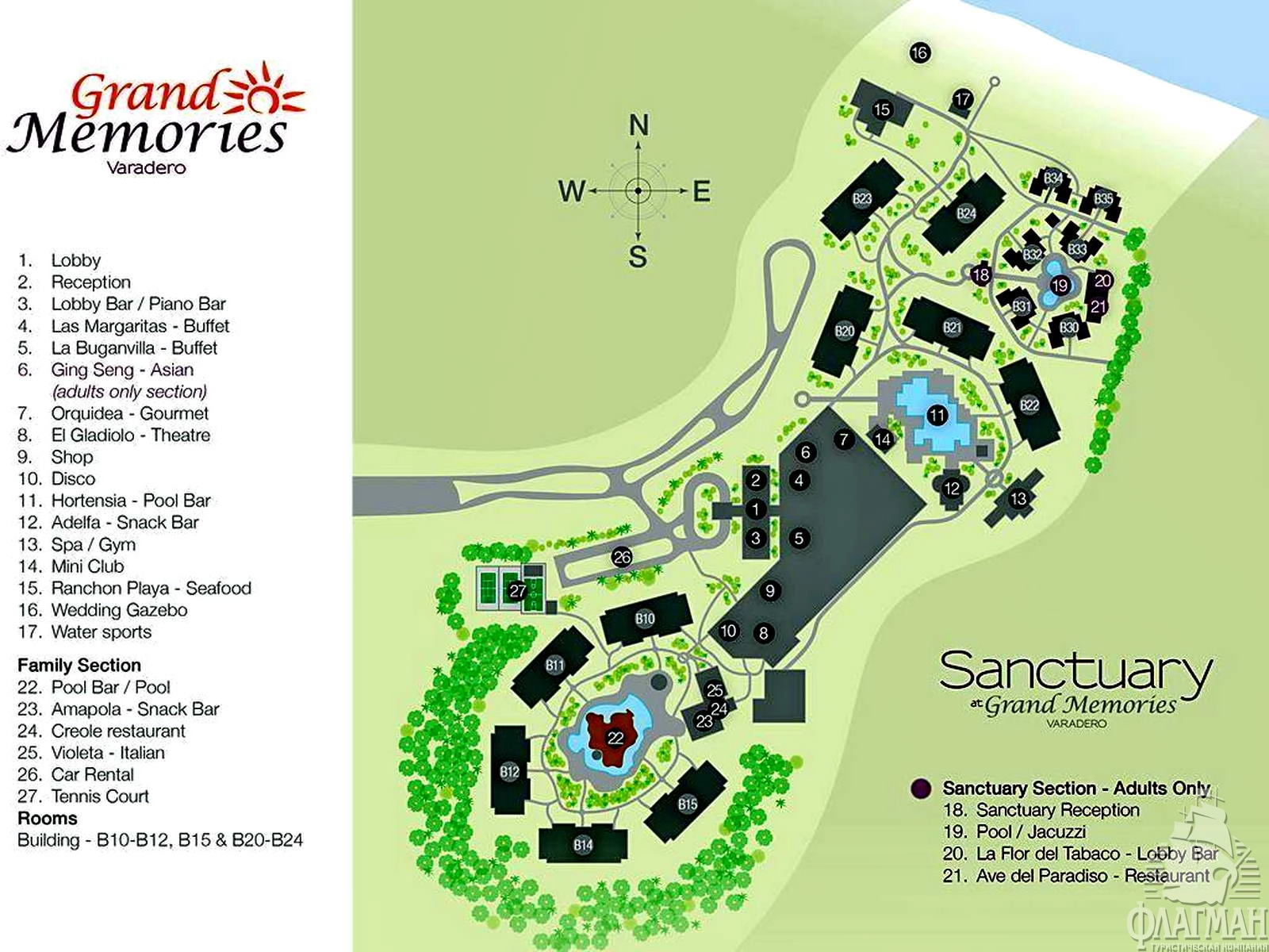Гранд Меморис Варадеро 5* - отель в новой части курорта с развитой инфраструктурой на первой линии у пляжа и большой зелёной территорией. Построен в 2010 году, как RIU Varadero. Отель состоит из основного одноэтажного здания и дополнительных трехэтажных зданий, расположенных посреди большого парка. Часть клуб-отеля отведена под крыло ADULTS ONLY (Sanctuary) класса DELUXE, предназначенное исключительно для лиц старше 18 лет. Эта часть отеля, находящегося совсем рядом с пляжем, состоит из нескольких зданий со 150 номерами. В отельную инфраструктуру входят 6 а-ла карт ресторанов, 7 баров, мини-клуб для детей от 4 до 12 лет, 2 бассейна с пресной водой, площадью 1 533 и 1 489 кв. м; 1 бассейн (392 кв.м) в секции Adults-Only. Для активных туристов: 2 теннисных корта и немоторные водные виды спорта: водные велосипеды, катамаран, сейлинг. Хороший выбор для отдыха как в кругу семьи, так и для пар.