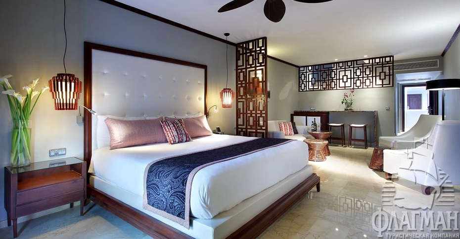 - 8 junior suites swim up (55 м2, спальня с king size кроватью и гостиной зоной, джакузи и балийская кровать на террасе с видом на море, прямой выход в бассейн, джакузи в ванной комнате, халаты и тапочки, ароматерапия в номере, макс. 2+2 чел.) - расположены в непосредственной близости от пляжа, на первом этаже
