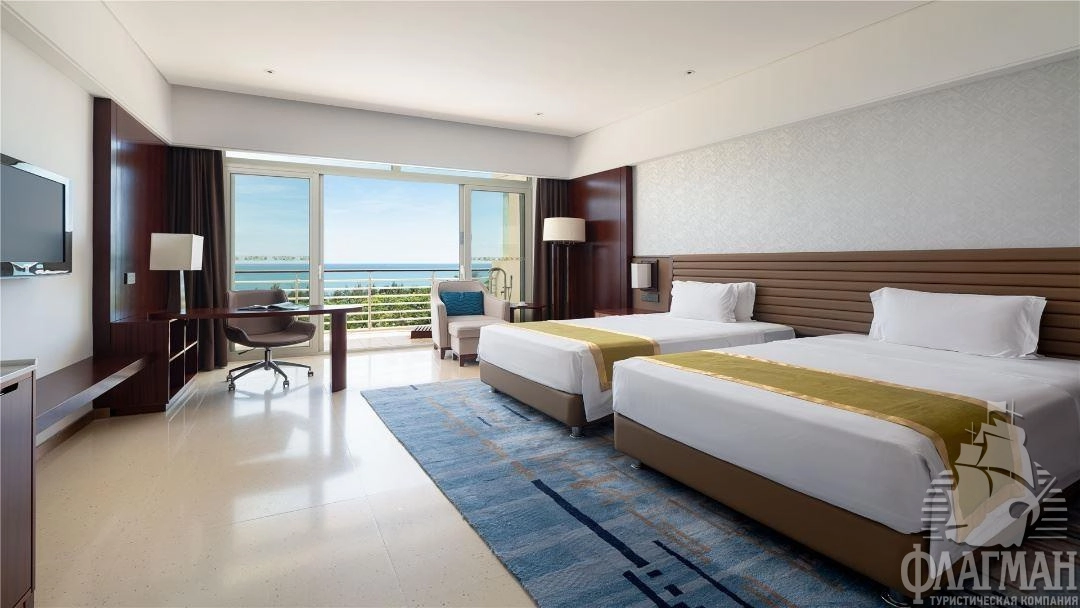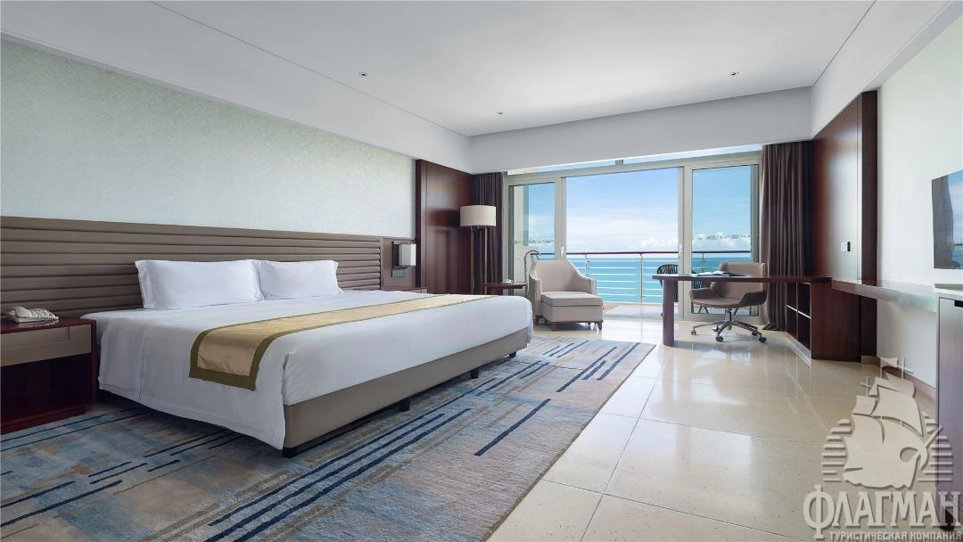 - Deluxe ocean view room (на 3-12 этажах, 55 кв. м, спальня, кровать King-size* или 2 односпальные кровати, ванная комната, балкон, вид на сад и горы);