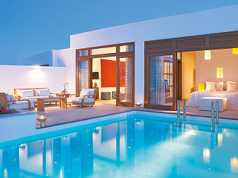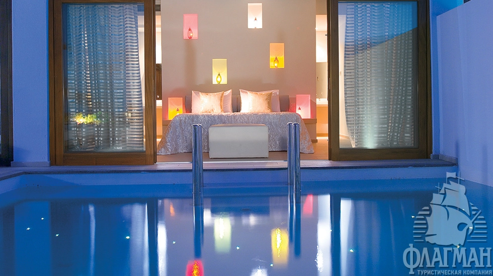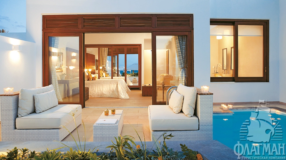 - Amirandes Vip 2-bedroom suite with private heated pool & gym SV/GV (вид на сад или на море, расположены в саду, на второй линии от моря, 2 спальни – одна из них с гостиной зоной, двуспальная кровать, доп. – 2 кровати, отдельная зона для фитнеса, терраса (50 м2), индивидуальный бассейн с подогревом (18 м2), макс. 4+1 чел., 85 м2),