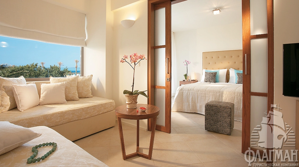- family suite SV/GV (вид на море или сад, 2 и 3 этажи в крыле Candia, спальня и гостиная с раздвижной дверью, основная кровать – двуспальная, доп. – 2 софы, макс. 2+2 или 3+1 чел., 40 м2),