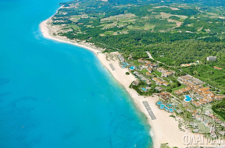 - песчаный (широкий песчаный пляж с панорамным видом на Ионическое море и соседние острова, протяженность береговой линии составляет 10 км, пляж идеально подходит для отдыха семей с детьми, обладает пологим входом в море и отмечен Голубым флагом за чистоту воды)