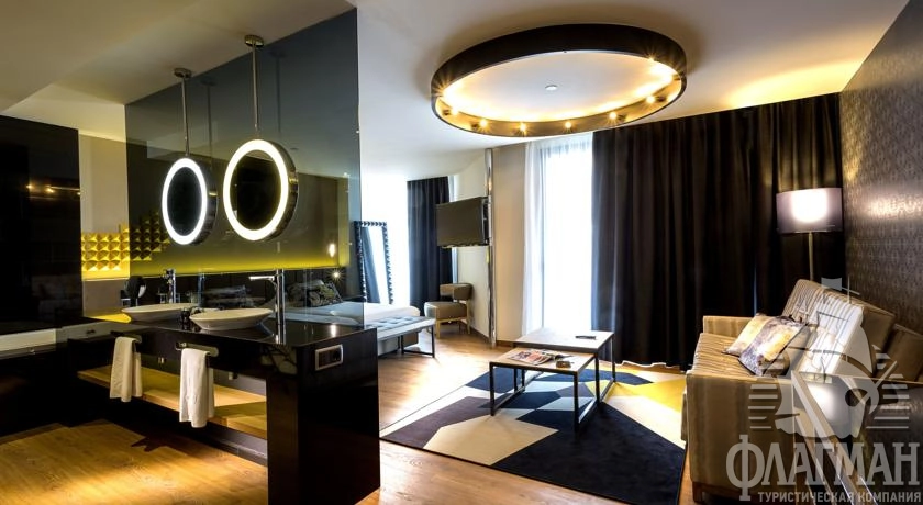 - 100 Studio Suite Gold (50 м2, джакузи, зона гостиной, диван-кровать, кофе-машина Nespresso, видео-приставка, макс. 3 или 2+2 чел.),