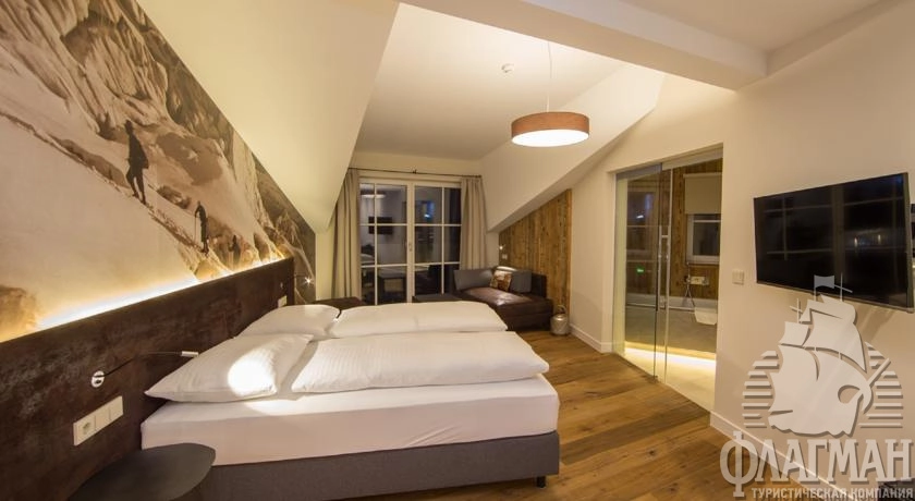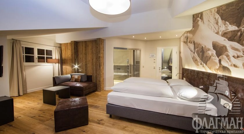 - Panoramasuite (45 м2, на 2 чел., на верхнем этаже, зона гостиной, большая ванная комната (отделена от спальни стеклянной дверью) с ванной и душем, уникальный панорамный вид)