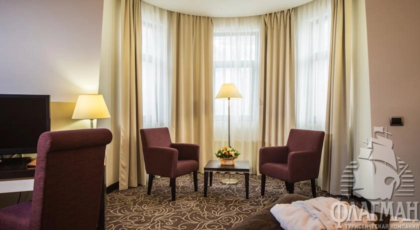 номер STUDIO (35-40 кв. м) - двуспальная кровать, система управления климатом, бесплатный Wi-Fi, спутниковое TV, телефон, мини-бар, сейф, душевая кабина, фен, халат и тапочки.