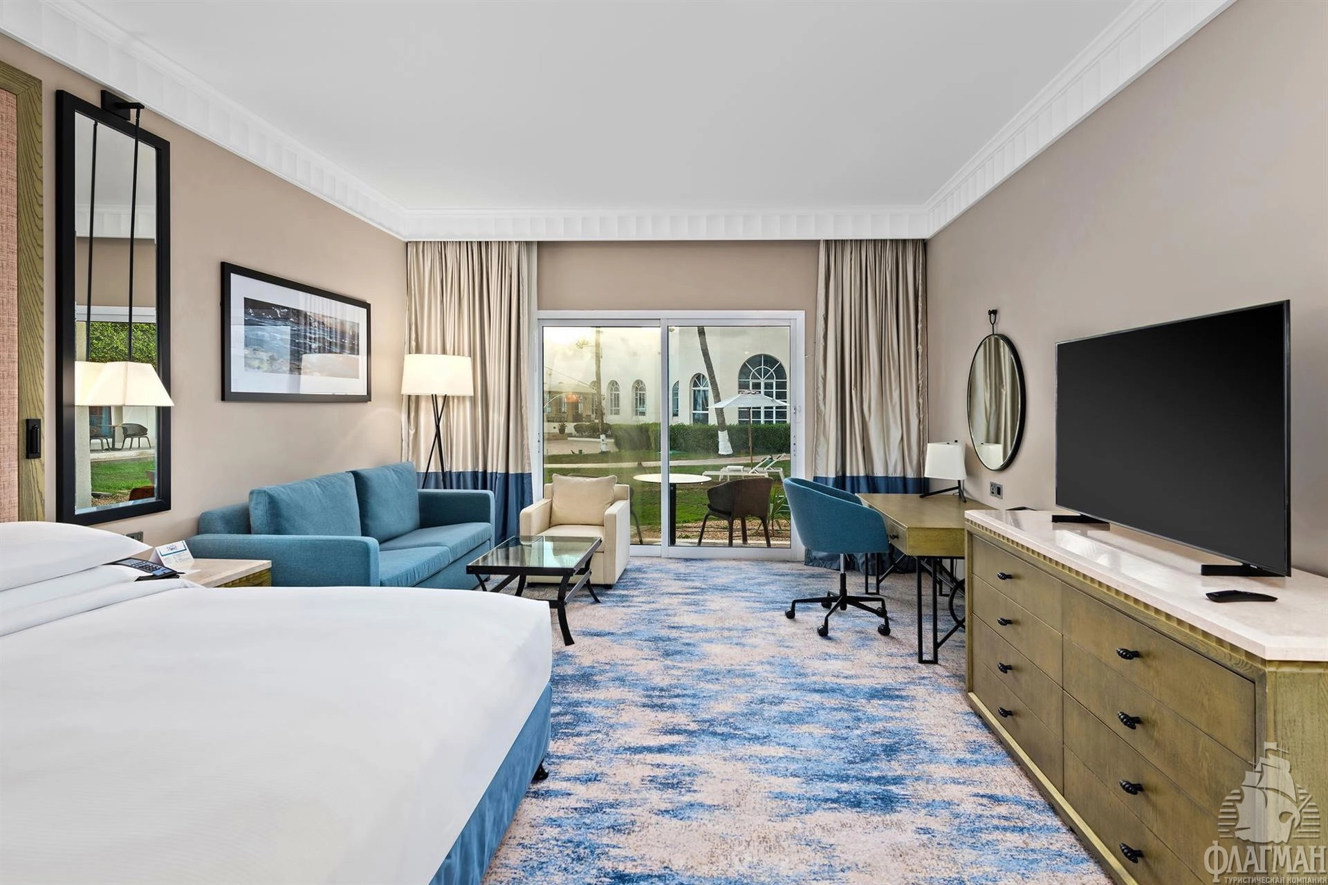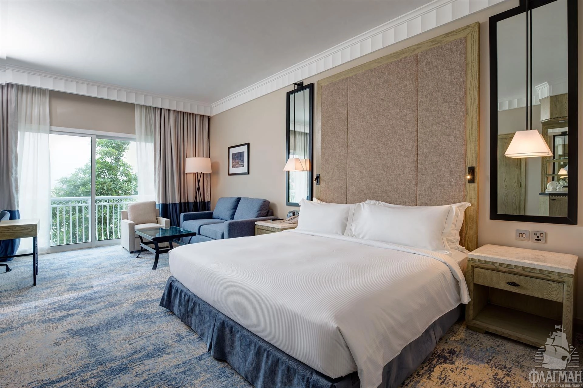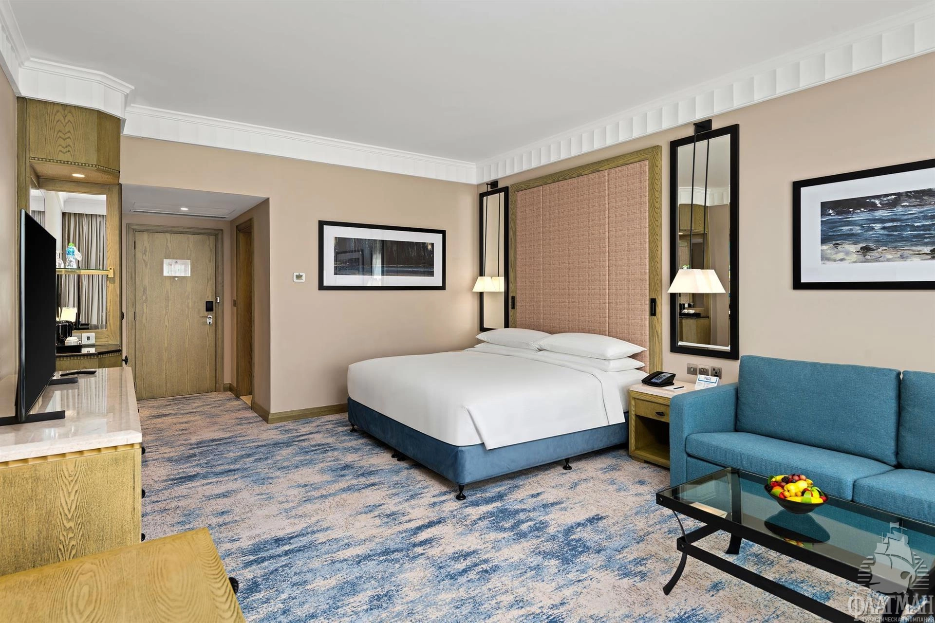 - спальня с двуспальной кроватью king-size или двумя раздельными кроватями, гостиная зона, письменный стол, кондиционер, ТВ, Wi-Fi (бесплатно), сейф, мини-бар, минеральная вода, ванная комната: душ, фен, туалетные принадлежности.