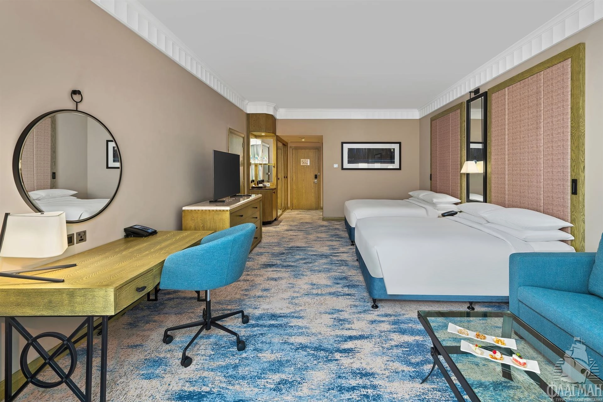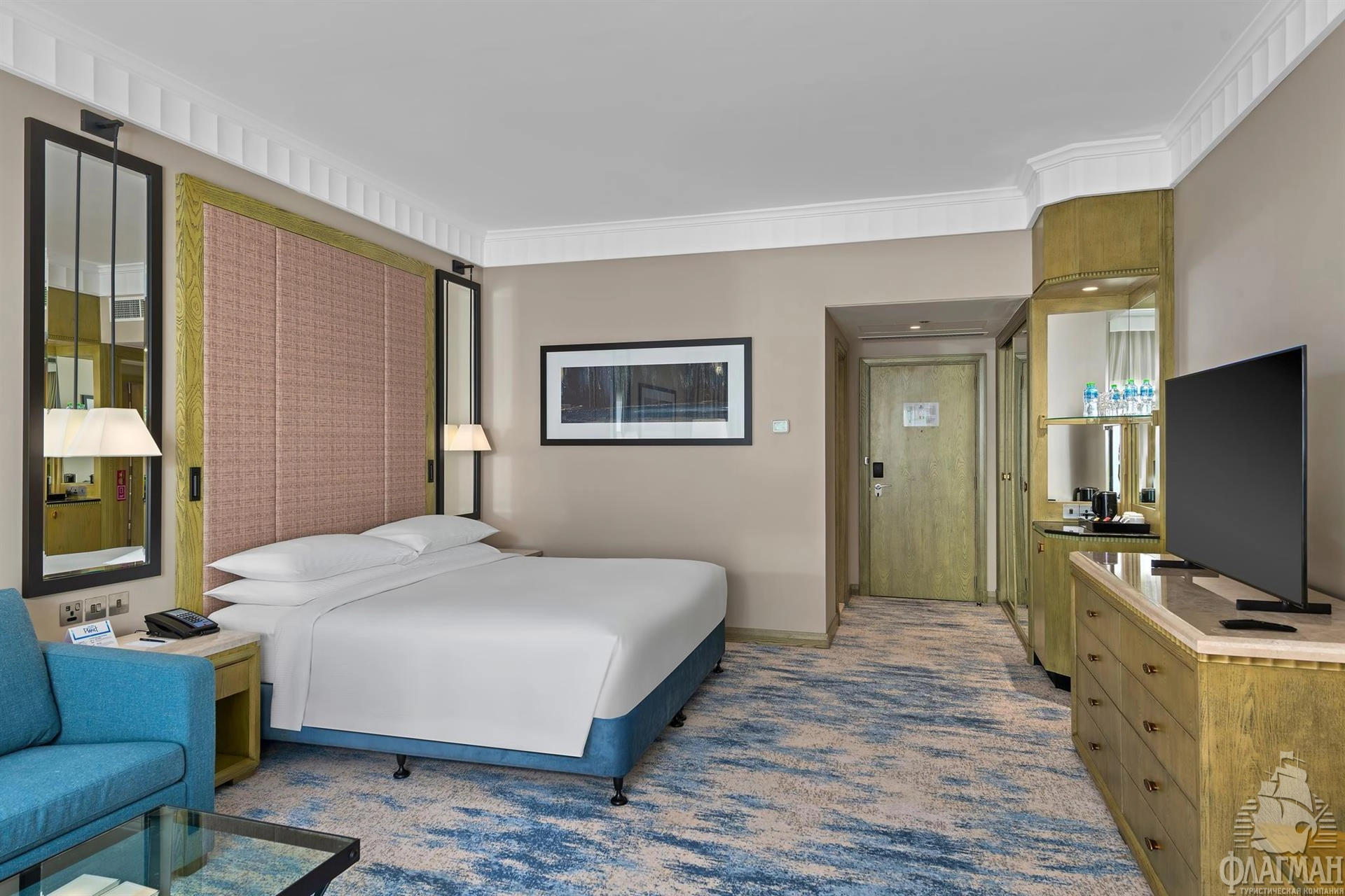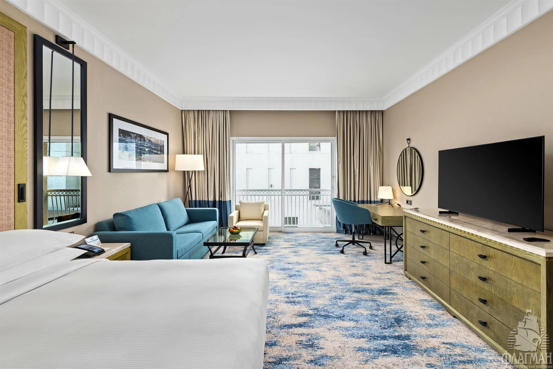 - спальня с двуспальной кроватью king-size или двумя раздельными кроватями, гостиная зона, письменный стол, кондиционер, ТВ, Wi-Fi (бесплатно), сейф, мини-бар, минеральная вода, ванная комната: душ, фен, туалетные принадлежности.