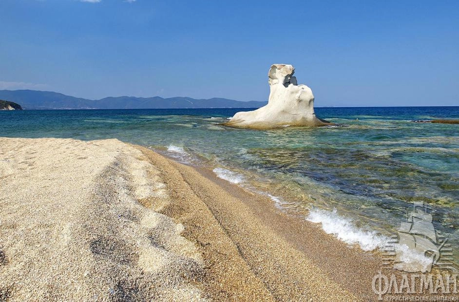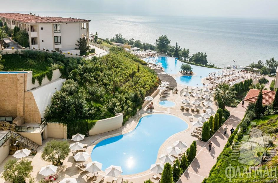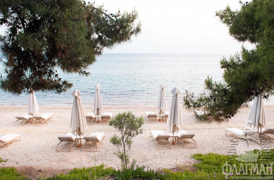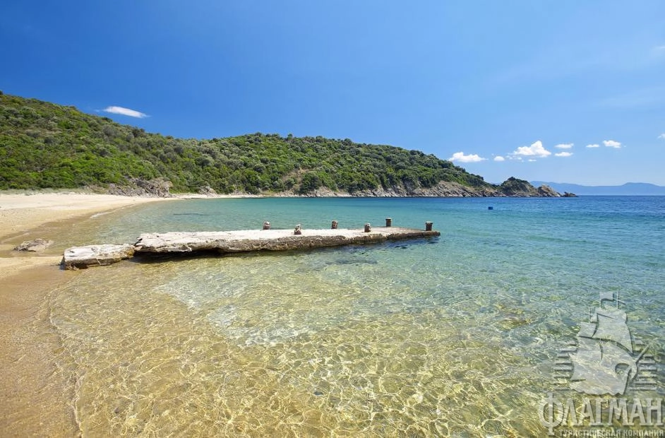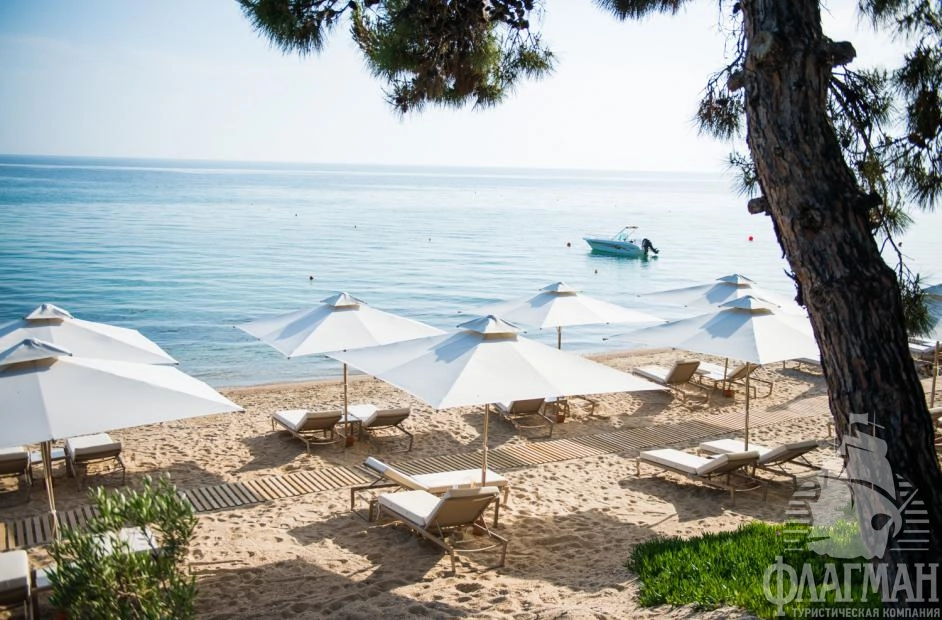 Расположен на западном побережье полуострова Кассандра, в 1 км от Неа Мудания, в 60 км от аэропорта г. Салоники, через дорогу от моря.