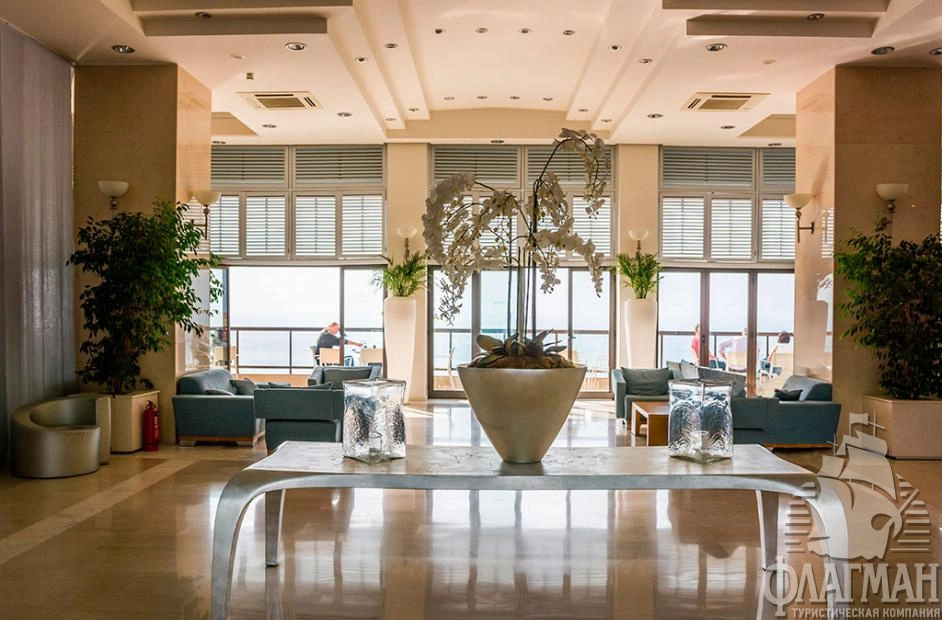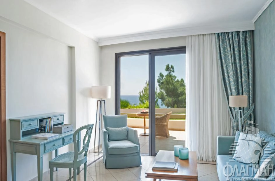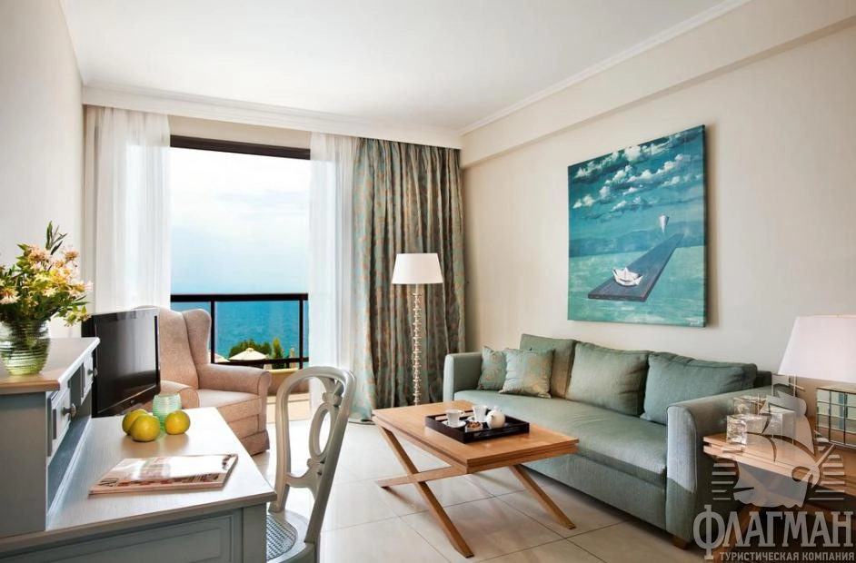 - junior suite SV (вид на море, спальня с гостиной зоной, осн. кровать – две односпальные или двуспальная, доп. – односпальная и раскладное кресло, макс. 3+1 чел., 35 м2);