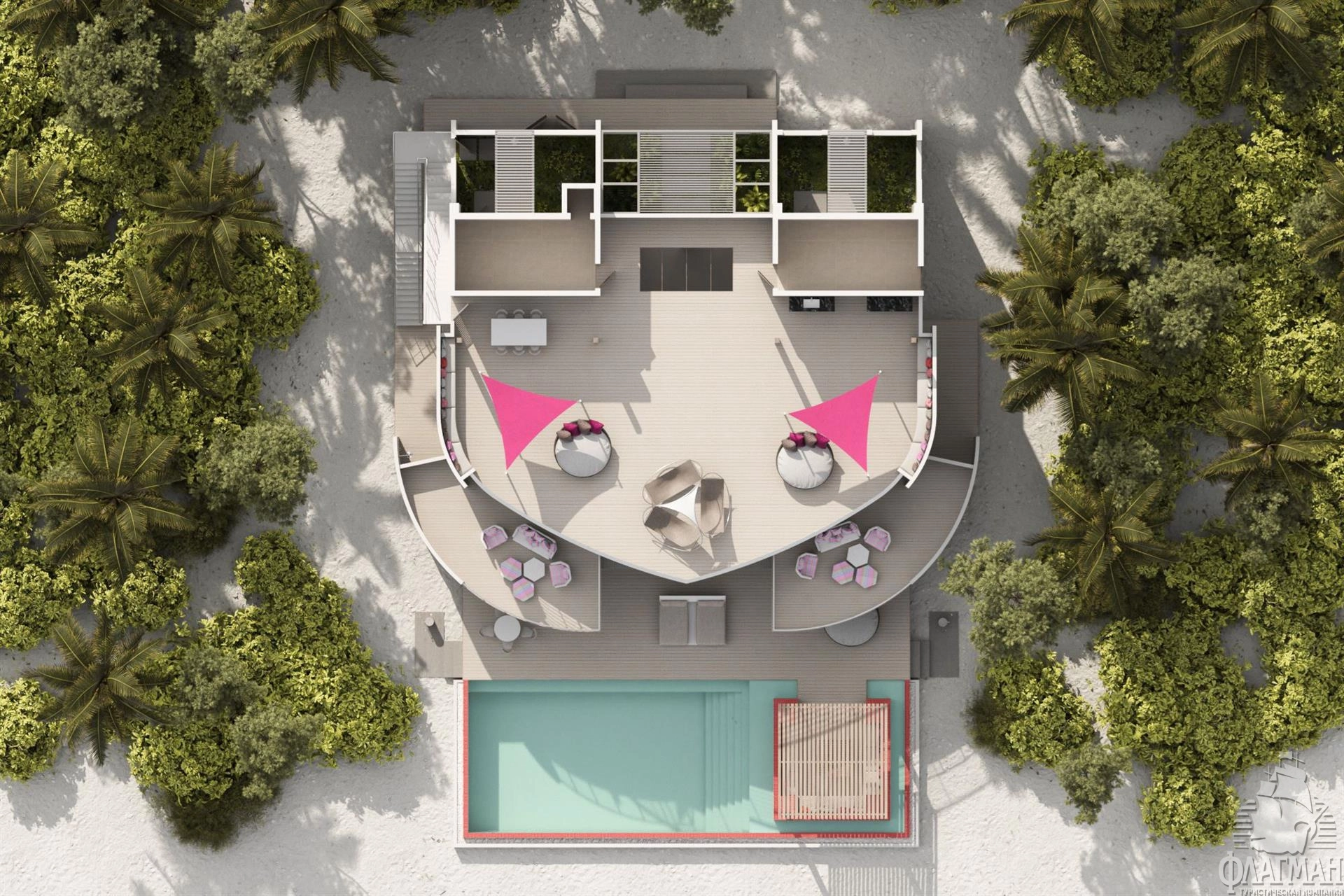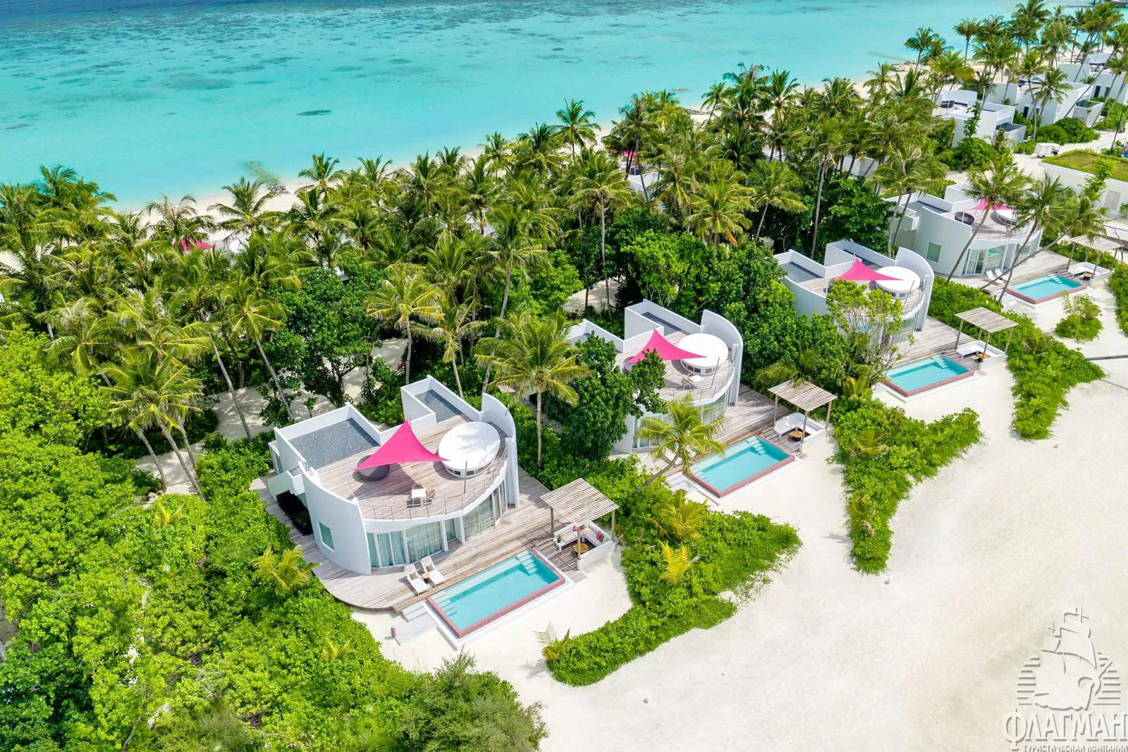 1 Three Bedroom Beach Retreat with Pool (~970 кв.м) - береговой двухэтажный ретрит с бассейном. Состоит из двух спален с кроватями king size, спальни с раздельными кроватями, просторной гостиной с обеденной зоной, ванных комнат, сауны, фитнес комнаты, оборудованной террасы на крыше с обеденной зоной, гамаками и зоной отыха, двух балконов на втором этаже и террасы с бассейном (18x6,3x1,2) и зоной для дневного отдыха на нижнем уровне. Максимальное размещение - 7 взрослых и 1 ребенок или 6 взрослых и 2 ребенка.