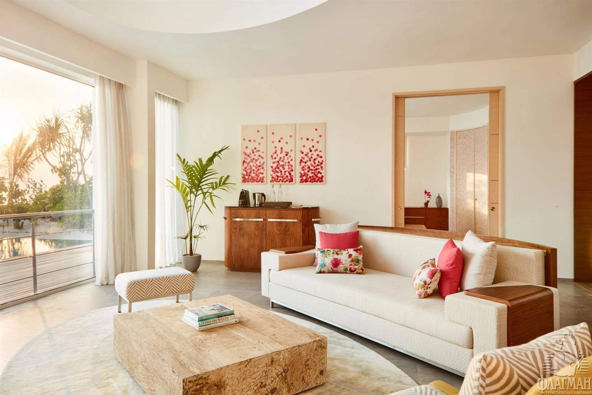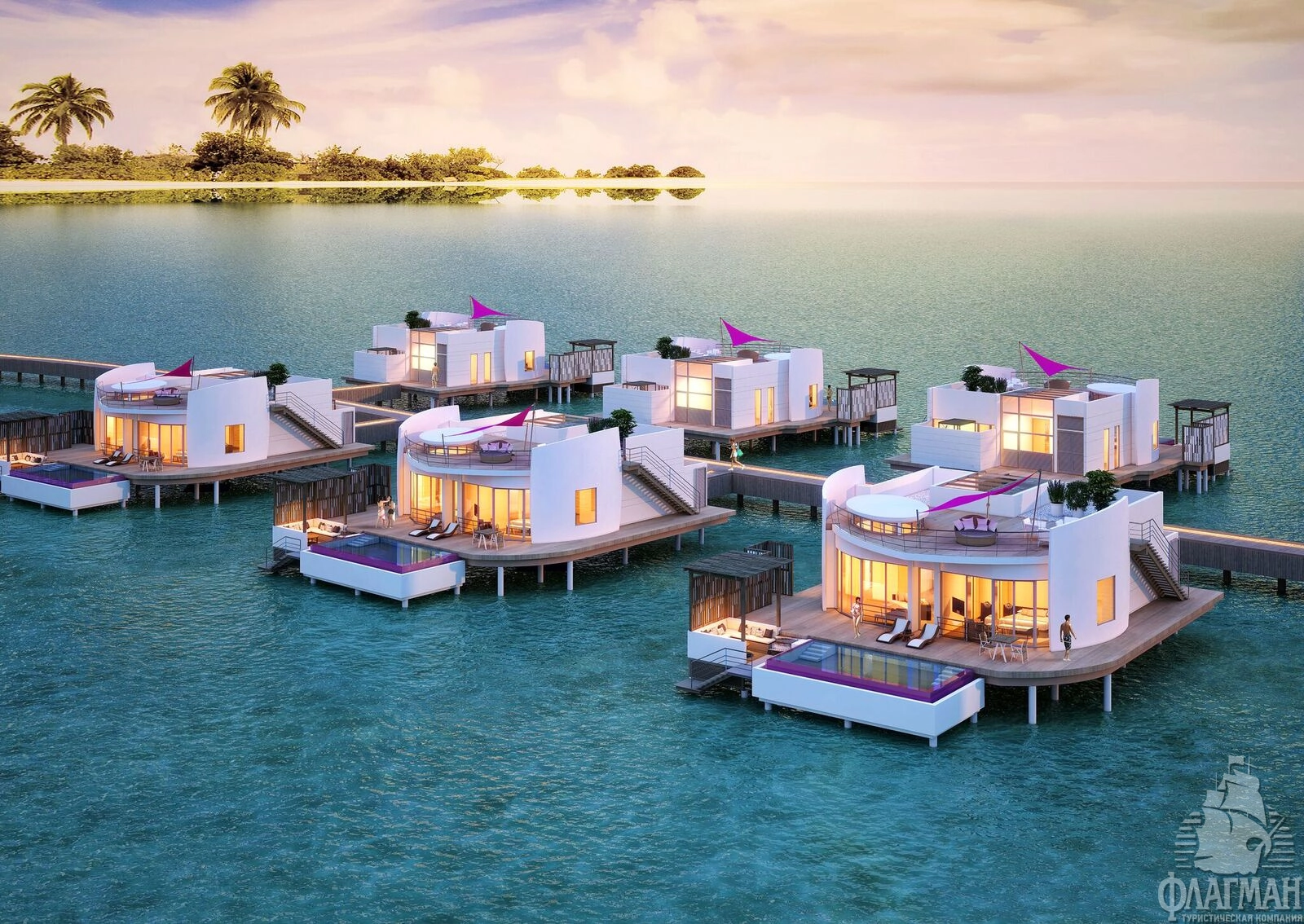 1 Three Bedroom Water Retreat with Pool (~997 кв.м) - водный двухэтажный ретрит с бассейном с виодм на закат. Состоит из 2 спален с кроватями king size, спальни с раздельными кроватями, просторной гостиной с обеденной зоной, ванных комнат, сауны, парной, фитнес комнаты, оборудованной террасы гамаками и зоной отдыха на крыше, двух балконов на втором этаже и террасы с бассейном (18x6,3x1,2), зоной для дневного отдыха и причалом для яхты на нижнем уровне. Максимальное размещение - 7 взрослых и 1 ребенок или 6 взрослых и 2 ребенка.