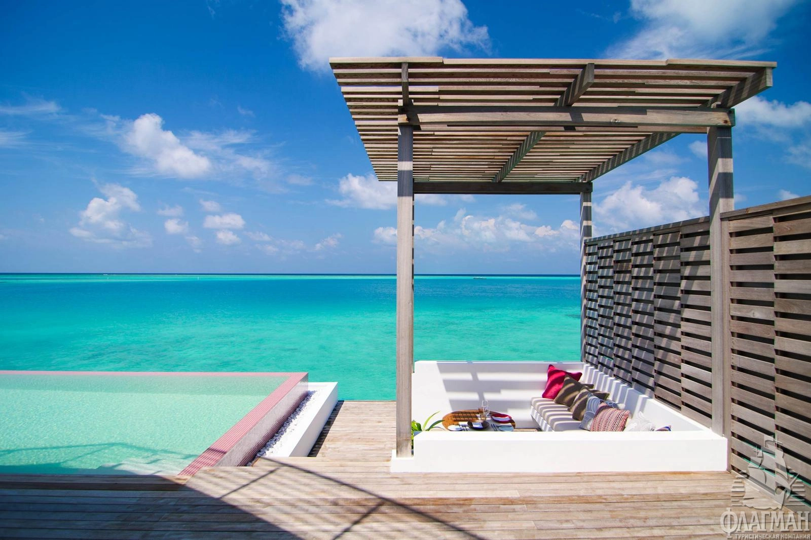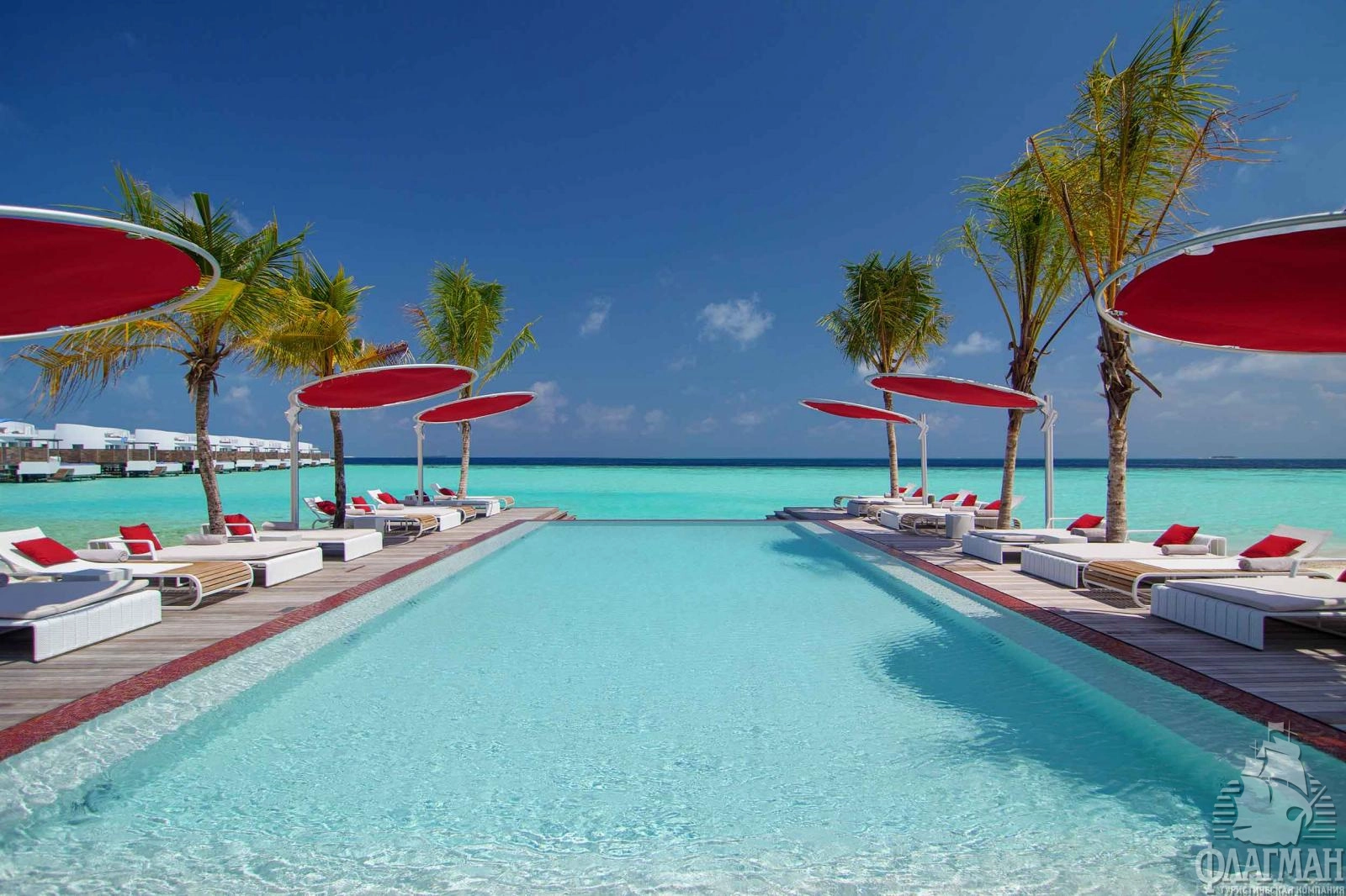 12 Lagoon Villa with Pool (~351 кв.м) - водные виллы с бассейном. Состоят из спальни с кроватью king-size, гостиной, ванной комнаты с отдельной ванной и крытым и открытым душами, оборудованной террасы на крыше и террасы с бассейном (7x3,5x1,2), зоной для отдыха на нижнем уровне и спуском в лагуну. Максимальное размещение - 3 взрослых и 1 ребенок или 2 взрослых и 2 ребенка.