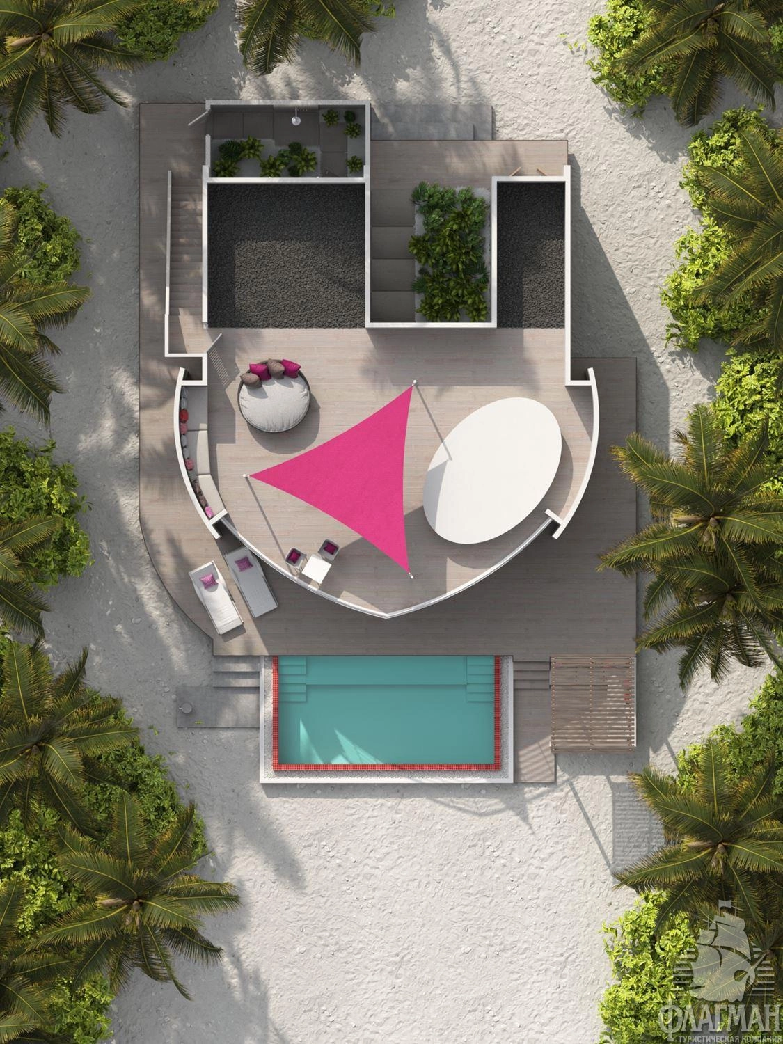 4 Two Bedroom Beach Residence with Pool (~680 кв.м) - пляжная трехкомнатная резиденция с бассейном. Состоят из гостиной с обеденной зоной, спальни с кроватью king-size, спальни с раздельными кроватями, 2 ванных комнат с отдельной ванной и крытым и открытым душами, оборудованной террасы на крыше и террасы с зоной отдыха и бассейном (14,3x4,2x1,2). Максимальное размещение - 5 взрослых и 1 ребенок или 4 взрослых и 2 ребенка.