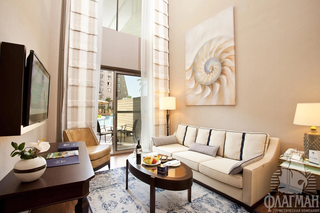 30 двухуровневых duplex family suite swim up (с видом на бассейн, на первом уровне: гостиная, ванная с душем; на втором уровне: 2 спальни с дверью, 2 ванные: одна из них с джакузи и душем, другая с душем; терраса с прямым выходом к бассейну, макс. 4+2 чел., 108 м2);