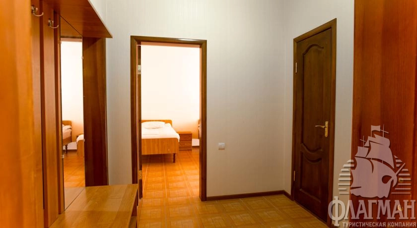 - 6-местный Стандарт. В номере: две изолированные комнаты, прихожая, ванная комната. В каждой комнате: 3 односпальные кровати, прикроватные тумбы, телевизор, шкаф. В ванной комнате: ванная, раковина, унитаз, полотенца, средства личной гигиены.