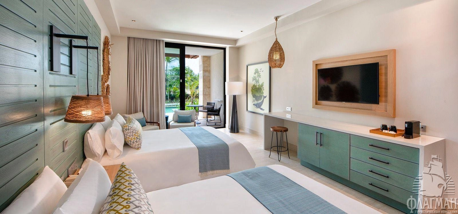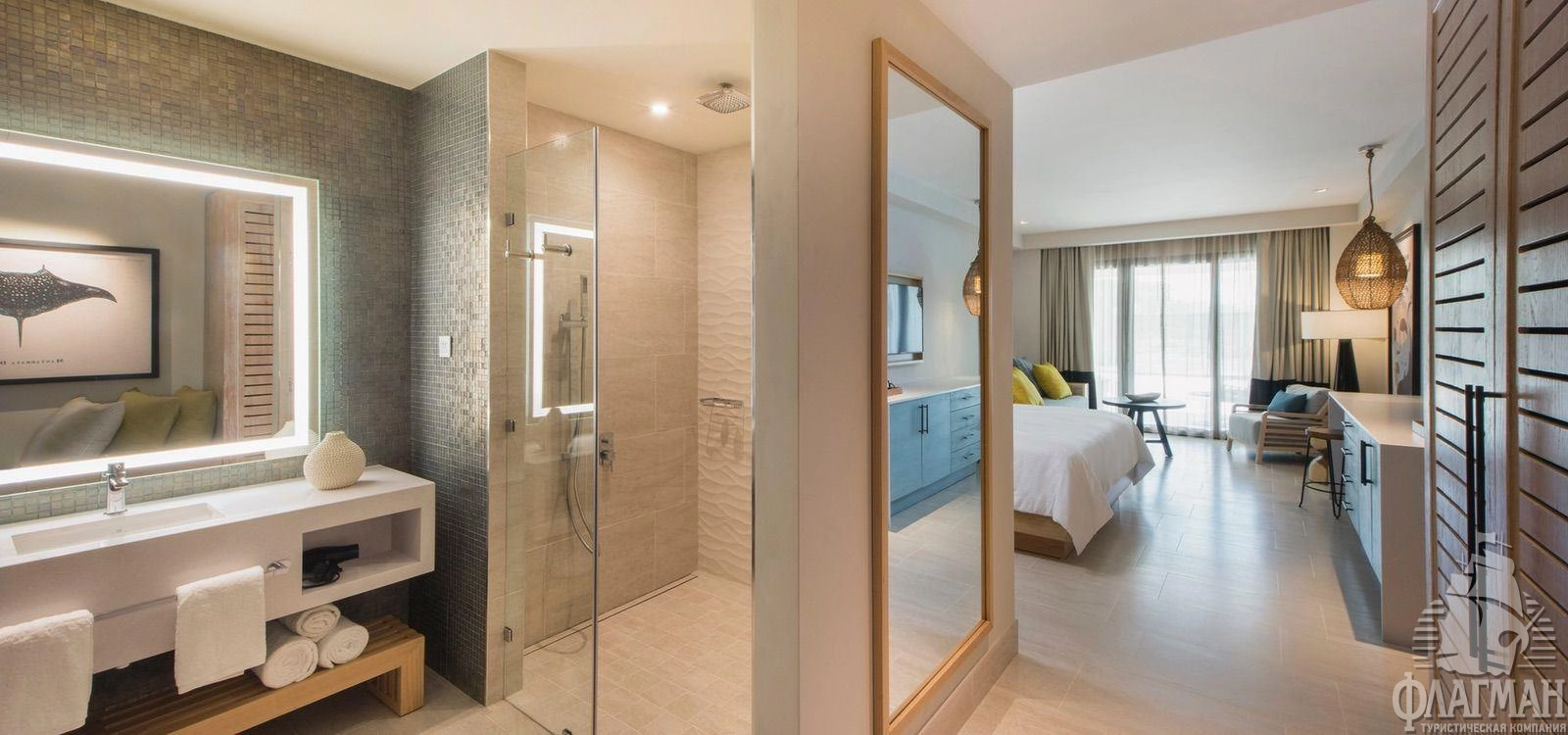 - Junior Suite Swim Up (43 м2 + терраса 12 м2, мин. 1 макс. 4 чел.) номера с прямым выходом к бассейну, кровать King Size или 2 Queen, в некоторых диван, ванная комната с душем;