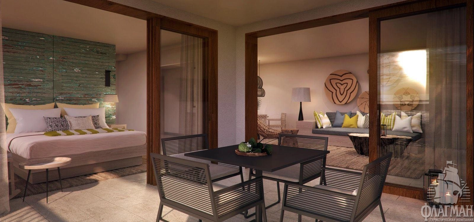 - Adults Only Junior Suite Swim Up (43 м2 + терраса 12 м2, мин. 1 макс. 4 чел.) номера с прямым выходом к бассейну, кровать King Size, диван, ванная комната с душем;