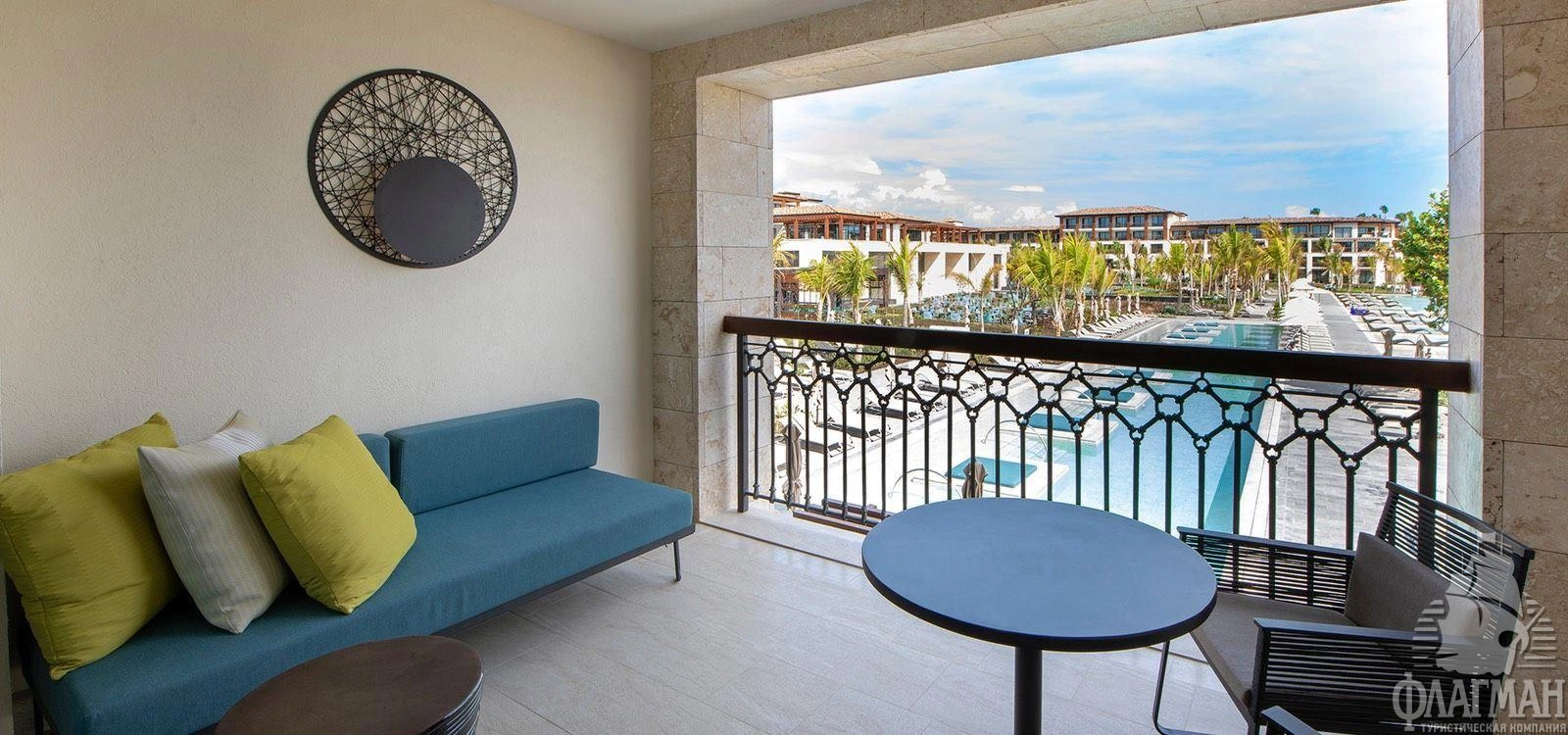 - Adults Only Junior Suite Pool View (43 м2 + терраса 11 м2, мин. 1 макс. 4 чел.) номера с видом на бассейн, кровать King Size, диван, ванная комната с душем;