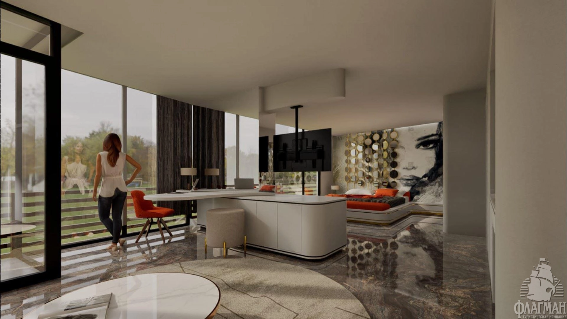 - FAMILY SUITE SWIMUP - расположены в саду, 44 кв.м, 2 спальни с дверью, 1 ванная комната, 2 ТВ, терраса с выходом в бассейн