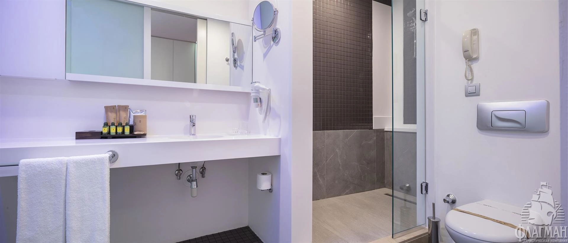 - DELUXE SUITE - номер в главном здании, 51 кв.м, 1-комната, двуспальная кровать и 1 односпальная, балкон, вид на море/боковой вид на море