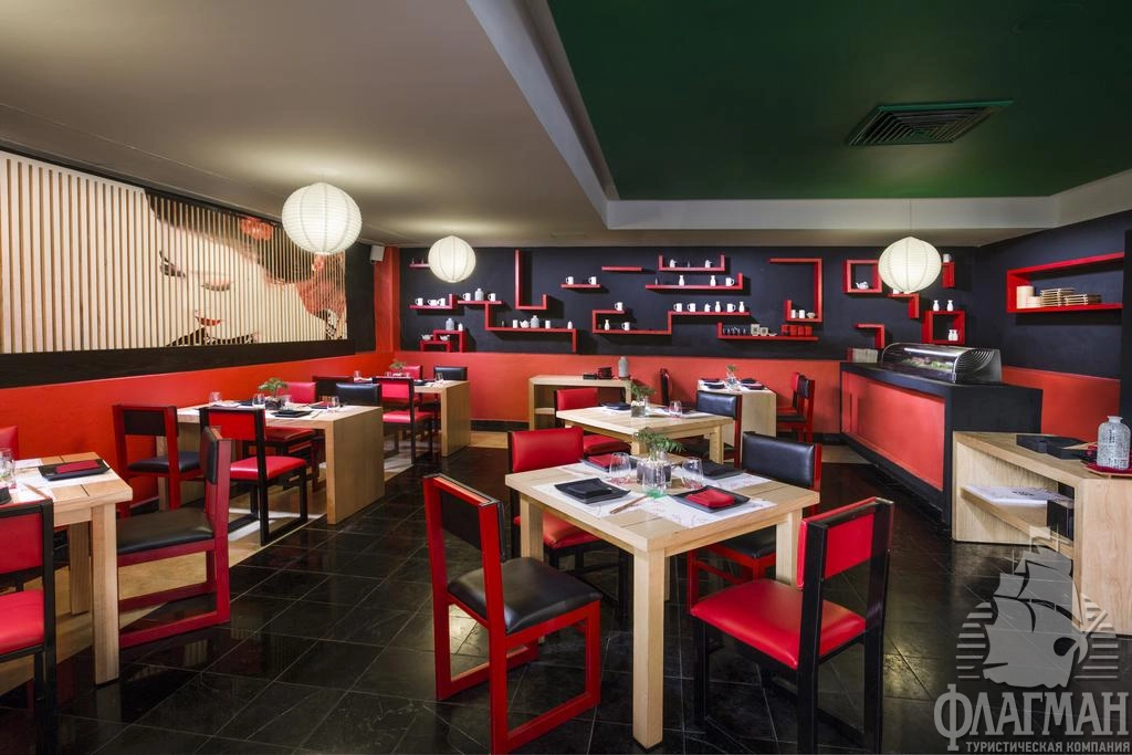 - рестораны: 9 (1 – шведский стол, 5 a la carte: мексиканский, гурме, суши, фьюжн, итальянский, 2 ресторана фаст-фуд и кофейня)