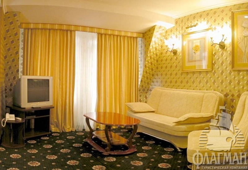 - 2-местный 3-комнатный VIP-апартамент «Lord», «Caliph» (макс. 2+3 чел., 50 кв. м, телевизор, кондиционер, душ/ ванна, туалет, фен, холодильник, банные принадлежности, сейф, телефон, 2-уровневые, южная сторона). Доп. место - диван, может быть установлен без ограничения по возрасту.