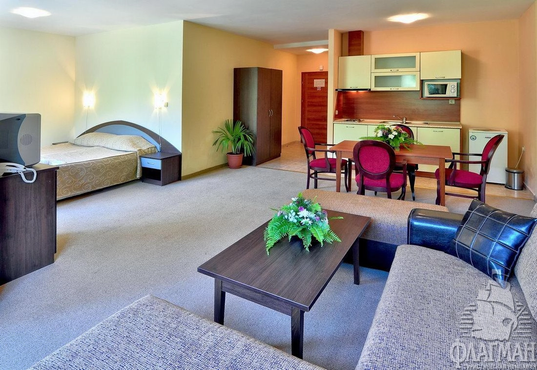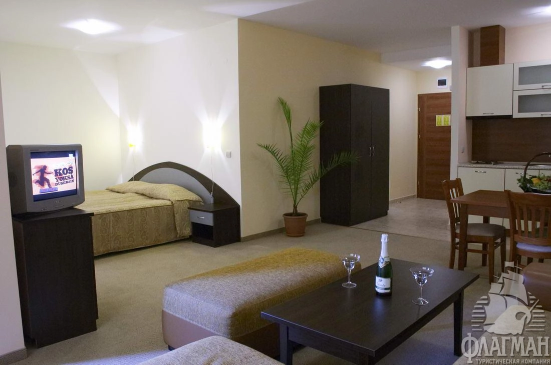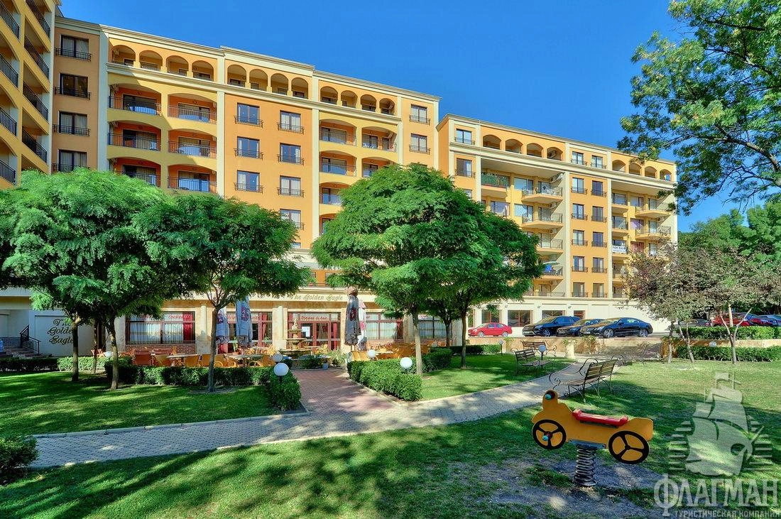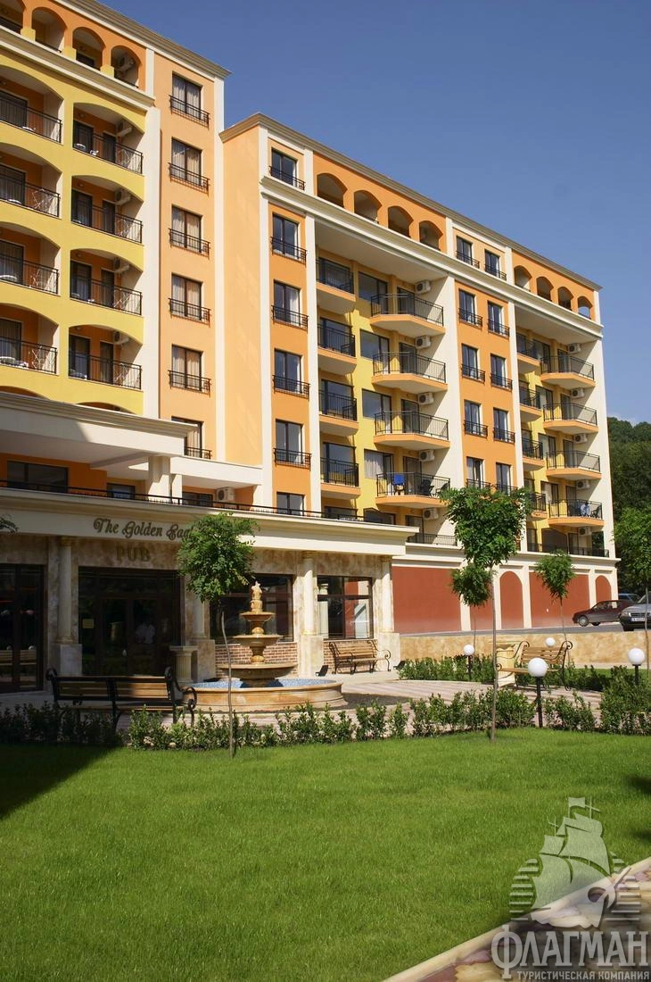 В курортном комплексе Золотые пески, в 25 км от аэропорта города Варна, в 300 м от центра курорта, в 600 м от плажа.