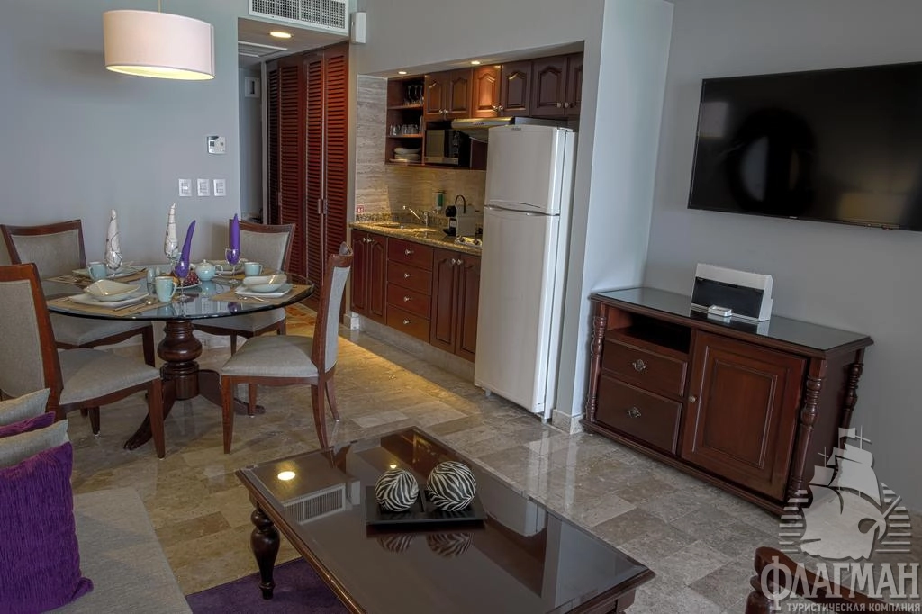 - Family Concierge One-bedroom Suite (макс. 2+2 чел., кровать king, гостиная с диван-кроватью, спальня, халаты, тапочки, 2 террасы, 2 ТВ, 60 м2, вид на море или лагуну, услуги Family Concierge),