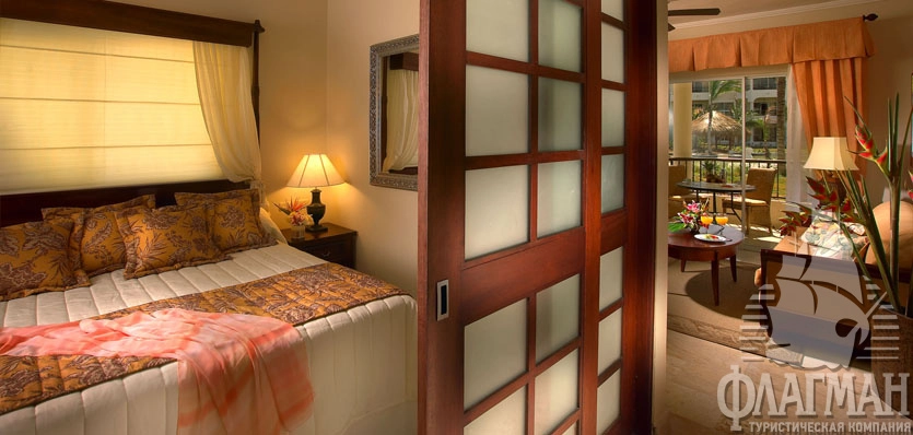 - 60 Luxury Junior Suite (52 м2, макс. 3 или 2+1+1 инфант) – вид на сад, спальня с дверью и гостиная с диваном - кроватью. Возможность объединения с номером One-Bedroom Master Suite.