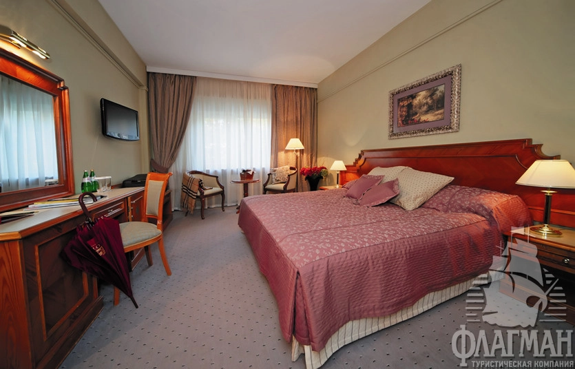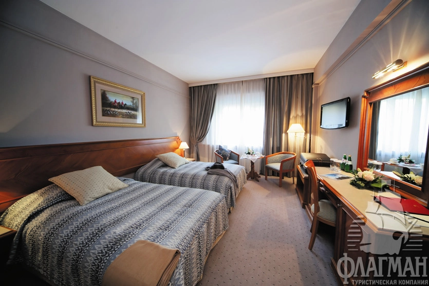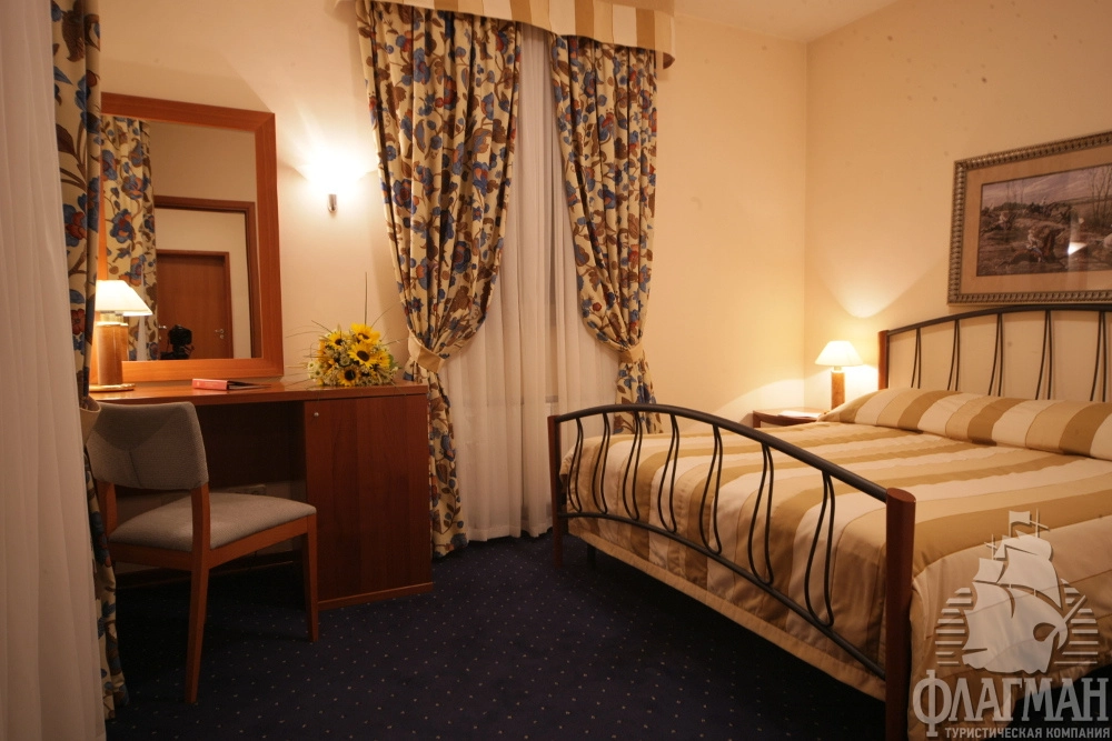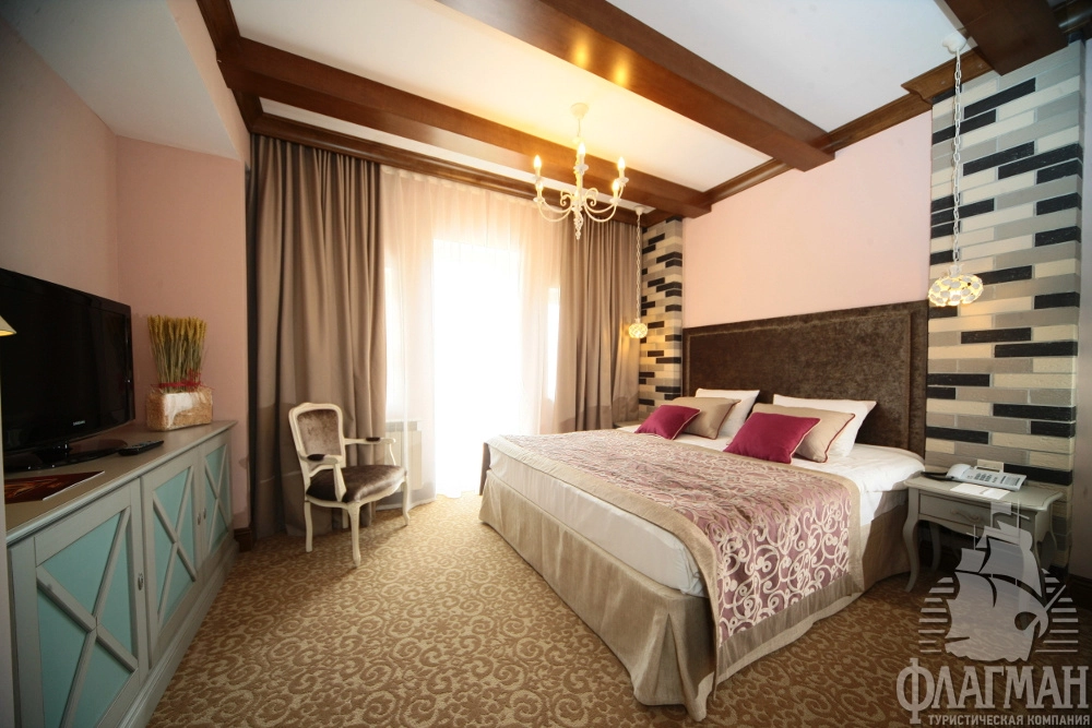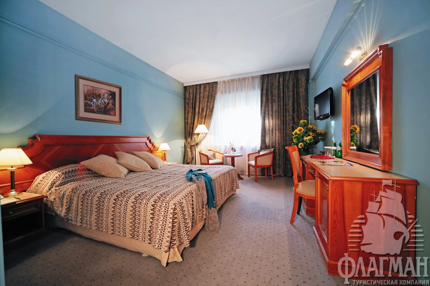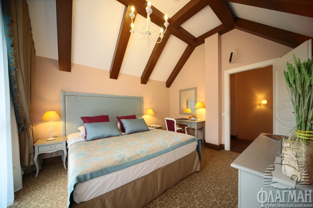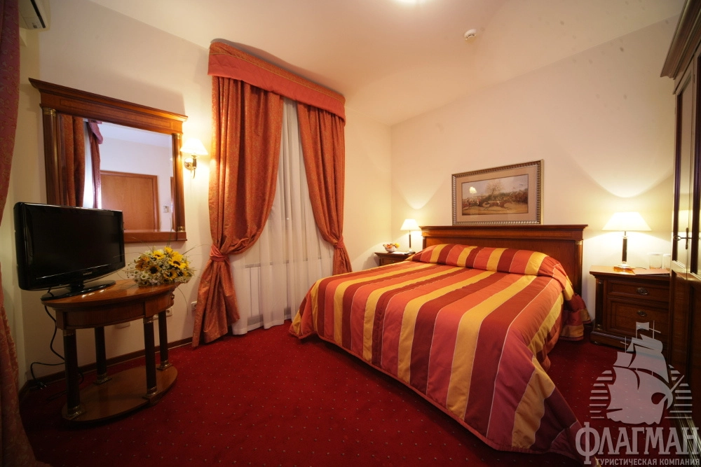- 2-местный стандарт (28-25 м2) – однокомнатный номер c двумя раздельными или одной большой кроватью. Номера корпуса А оснащены классической ванной. В корпусе В установлена душевая кабина. Некоторые номера имеют выход на летнюю террасу. В номере: спутниковое ТВ, мини-бар, сейф, общая система вентиляции и кондиционирования, тапочки, телефон, фен, махровые салфетки, набор принадлежностей для ванных комнат, стаканы, комплекты полотенец, халат махровый.