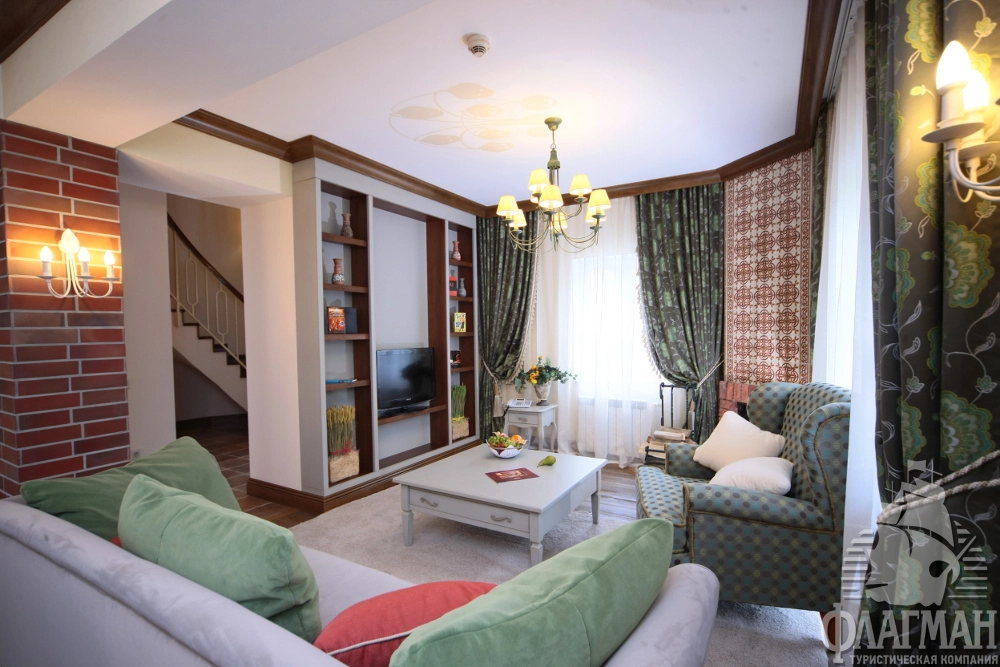 - 2-местный 2-х комнатный люкс двухуровневый (72 м2) – двухэтажные номера. На первом этаже находится небольшая кухня, просторная гостиная, санузел, остекленная терраса с прекрасным видом на горы (в корпусе В). На втором этаже – уютная спальня с большой кроватью, гидромассажная ванна, совмещенный санузел. В номере: спутниковое ТВ, мини-бар, сейф, общая система вентиляции и кондиционирования, тапочки, телефон, фен, махровые салфетки, набор принадлежностей для ванных комнат, стаканы, комплекты полотенец, халат махровый, электрическая плита (в корпусе B), чайник, набор посуды на 4 персоны.