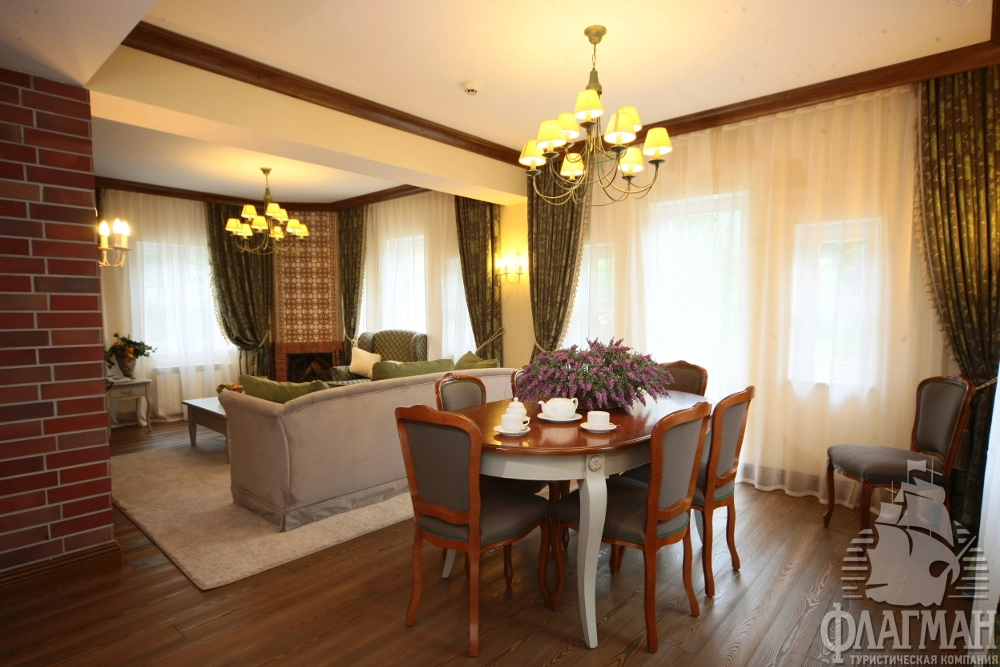 - 4-местный 3-х комнатный Вилла-Премьер (274 м2) – трехуровневые коттеджи с балконами. Их стиль отличают простота, уют и продуманность деталей. На первом этаже – гостиная с дровяным камином и кухней-столовой, выход на балкон. На третьем этаже – кухня-столовая, большой закрытый балкон, гостиная. Четыре спальни расположены на 3 этажах, каждая со своей ванной комнатой. Три спальни с двуспальной кроватью, одна спальня с двумя раздельными кроватями. Все виллы оборудованы элегантной мебелью классического стиля и оформлены изысканным текстилем. В номере: спутниковое ТВ, мини-бар, сейф, общая система вентиляции и кондиционирования, тапочки, телефон, фен, махровые салфетки, набор принадлежностей для ванных комнат, стаканы, комплекты полотенец, халат махровый, кухонная плита, чайник, набор посуды на 5 персон.