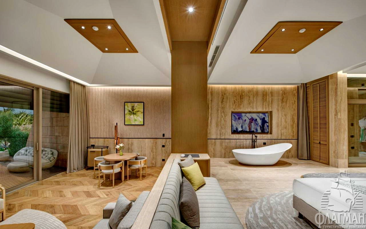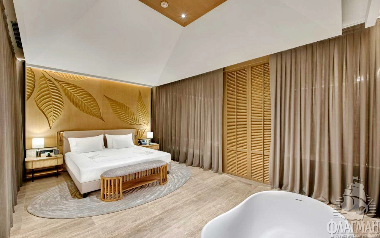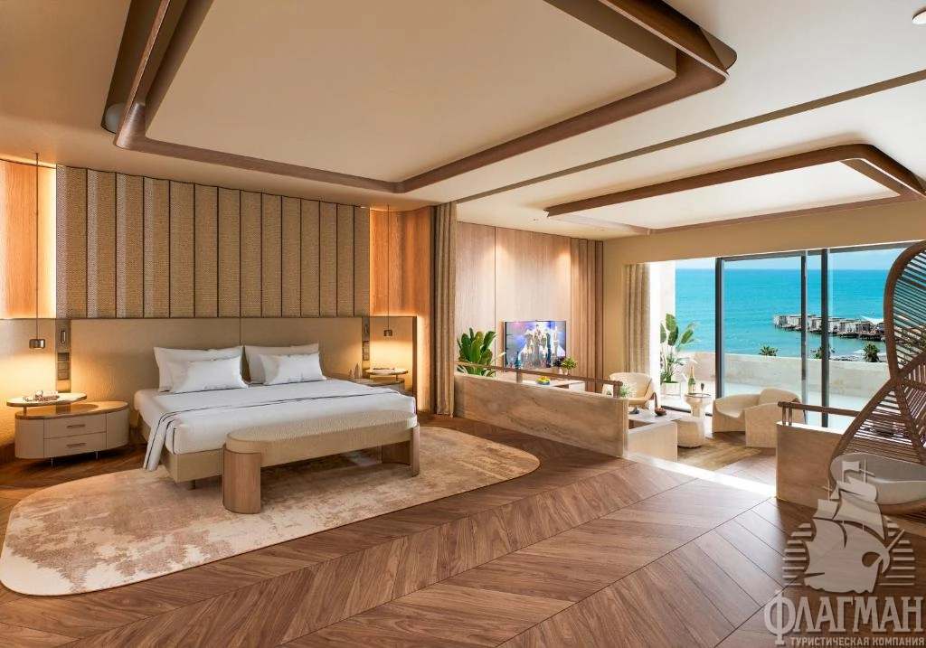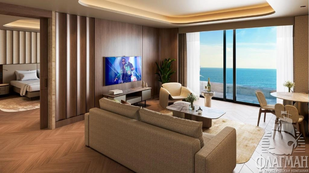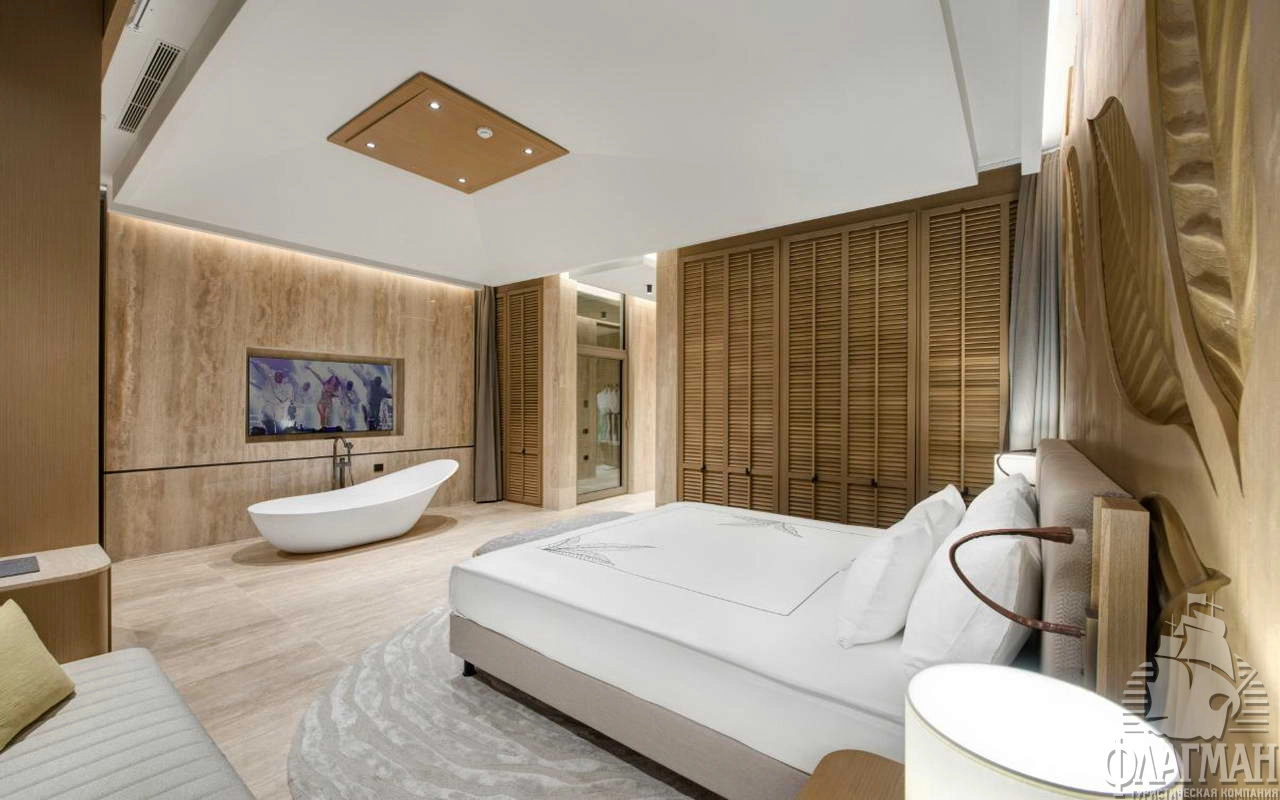 - Crown signature suite (1700 м²) расположен в основном здании: балкон, гостиная, мини-кухня, SPA-зона, рабочая зона, 5 спален (три – с кроватью king-size, две – с двумя отдельными кроватями), 7 ванных комнат (четыре – с ванной и душевой кабиной, три – с душевой кабиной). Вид на море.