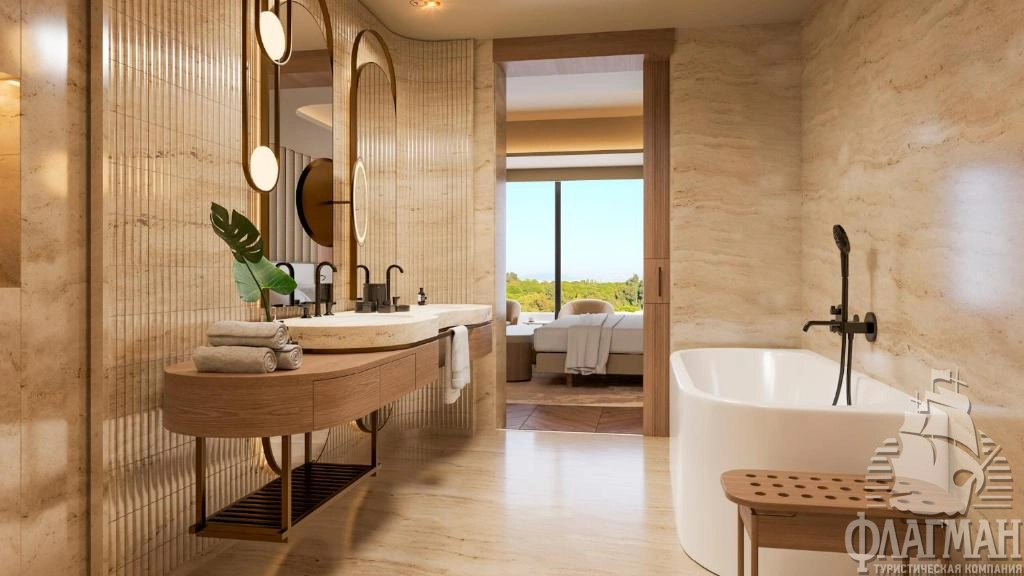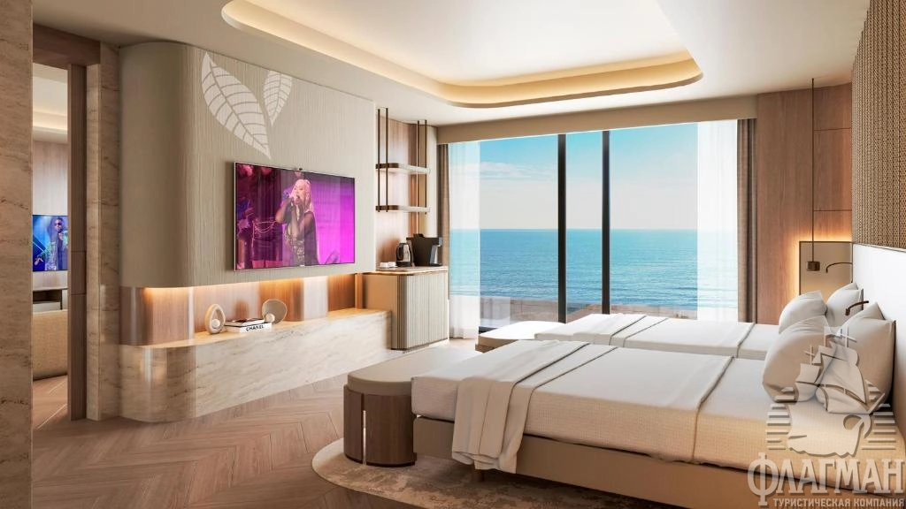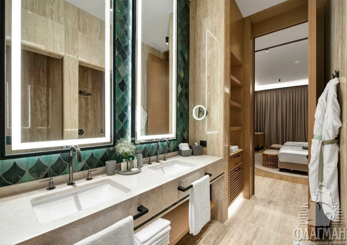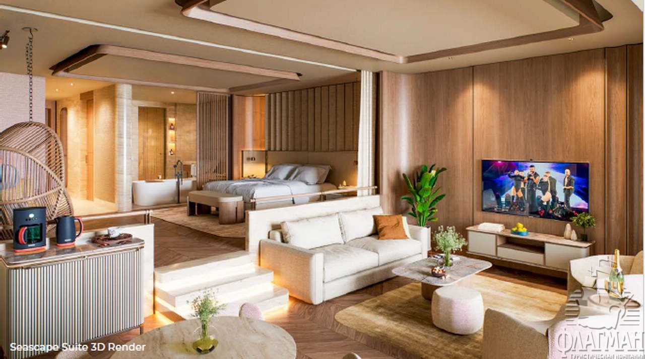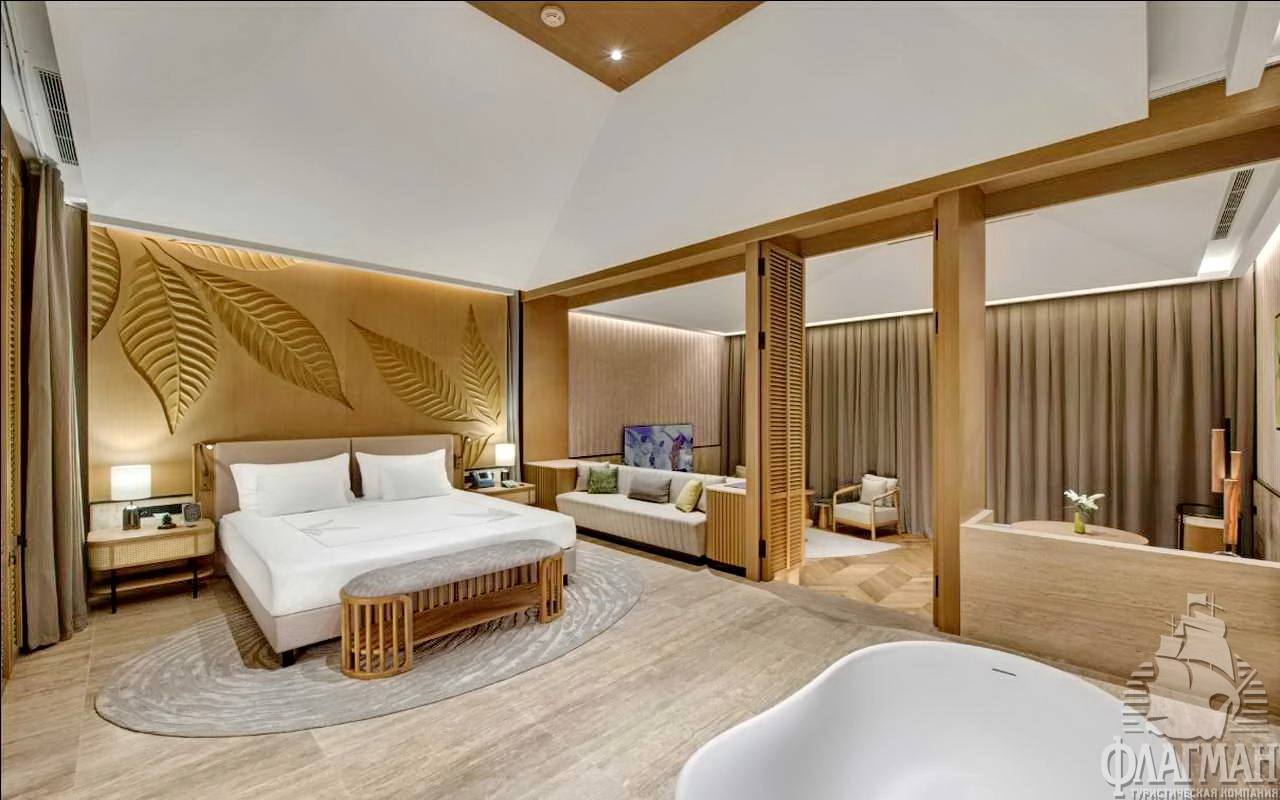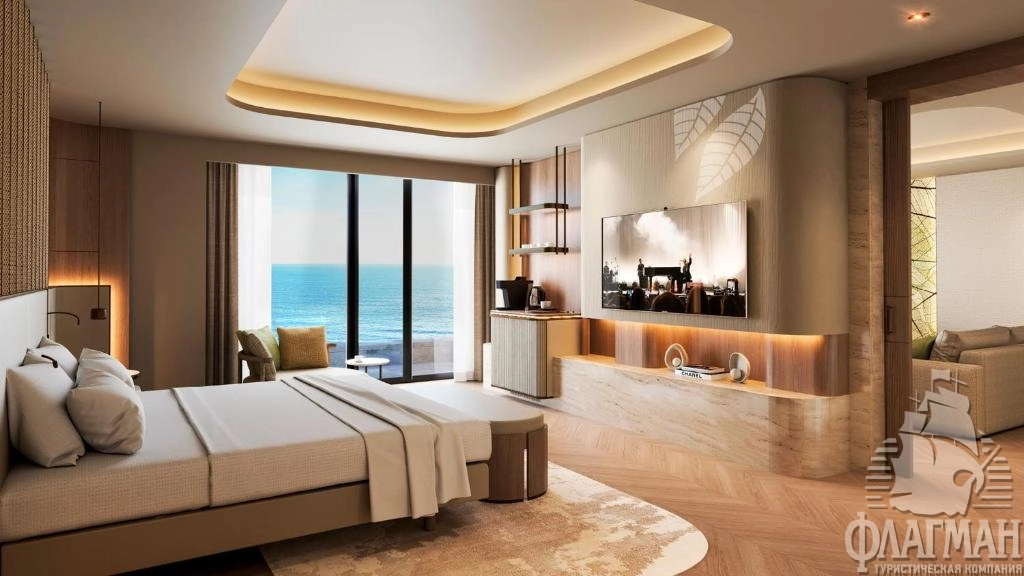 - Crown signature suite (1700 м²) расположен в основном здании: балкон, гостиная, мини-кухня, SPA-зона, рабочая зона, 5 спален (три – с кроватью king-size, две – с двумя отдельными кроватями), 7 ванных комнат (четыре – с ванной и душевой кабиной, три – с душевой кабиной). Вид на море.