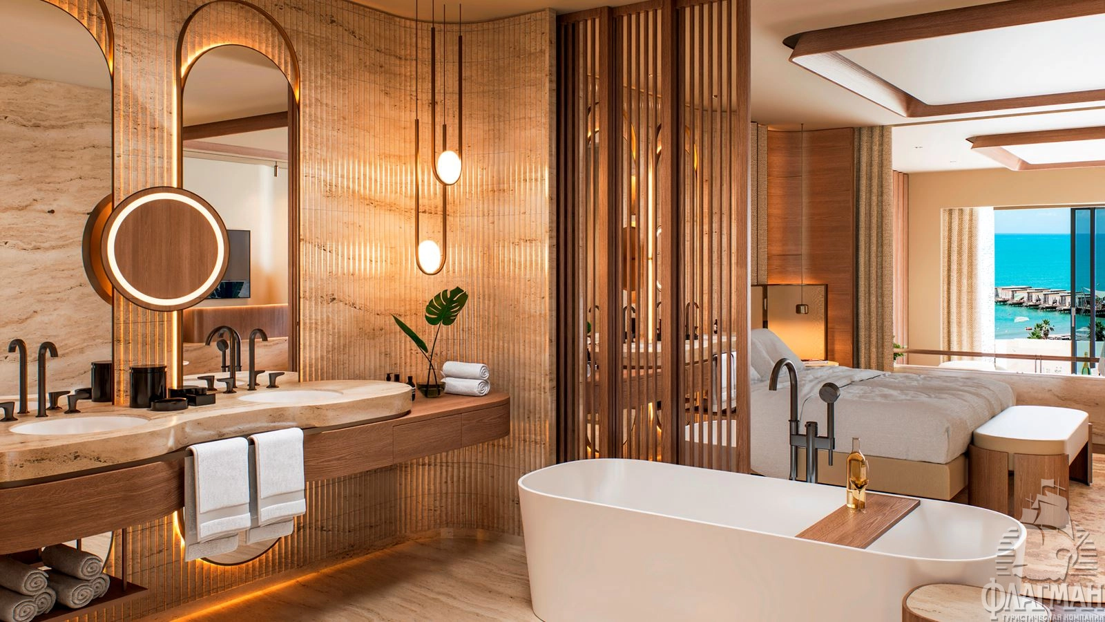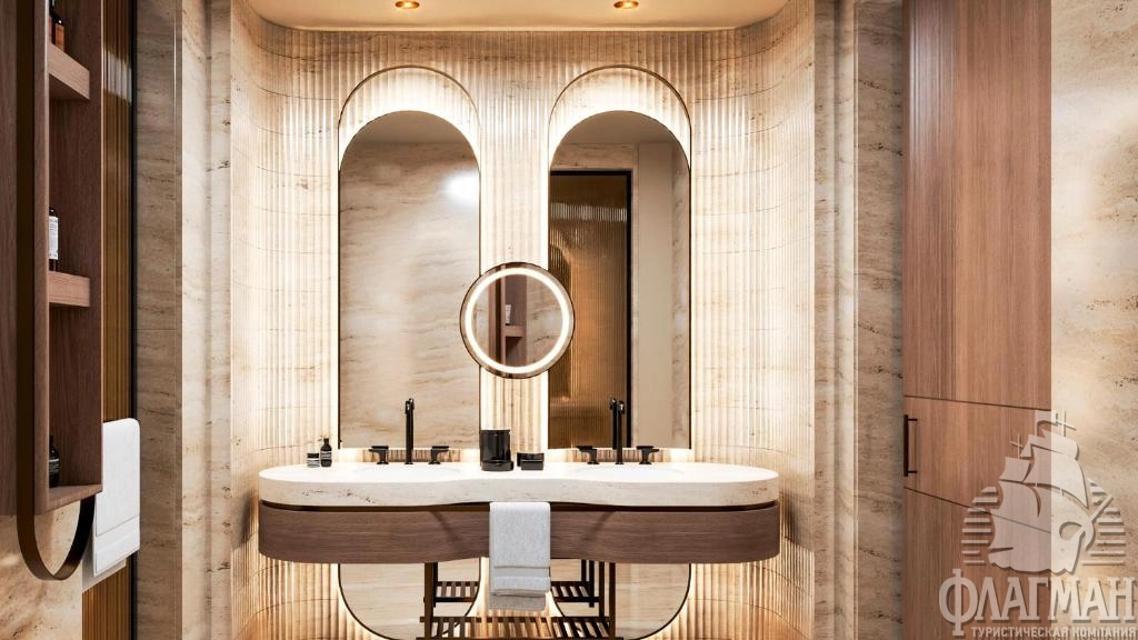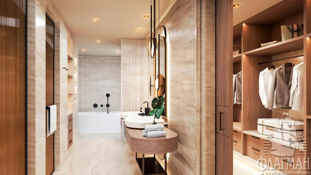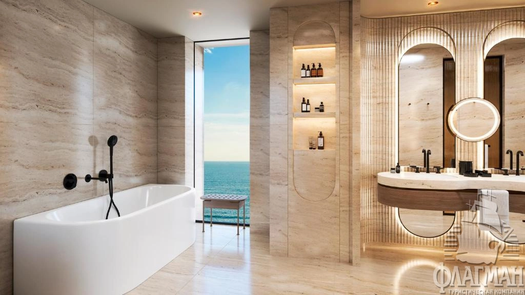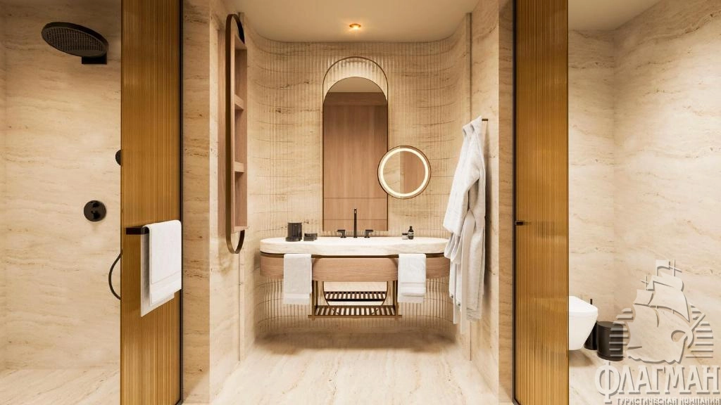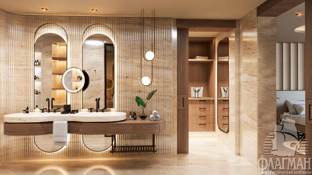 - Crown signature suite (1700 м²) расположен в основном здании: балкон, гостиная, мини-кухня, SPA-зона, рабочая зона, 5 спален (три – с кроватью king-size, две – с двумя отдельными кроватями), 7 ванных комнат (четыре – с ванной и душевой кабиной, три – с душевой кабиной). Вид на море.