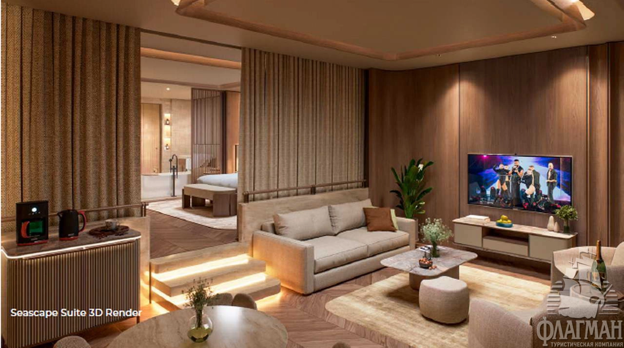 - Seascape suite (110 м²) расположены в основном здании: балкон, гостиная зона, спальня с кроватью king-size или двумя отдельными кроватями, ванная комната с ванной и душевой кабиной. Номера имеют открытую планировку: спальная и ванная зоны разделены раздвижной панелью. Для дополнительной приватности спальню от гостиной зоны можно отделить шторой. Вид на море (боковой и прямой, без конкретизации).