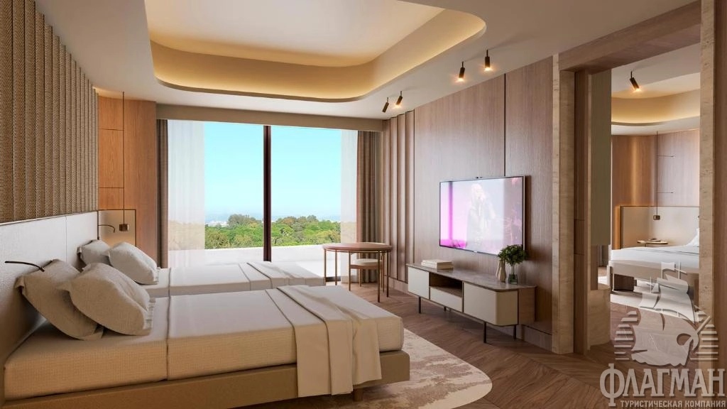 - Family suite (128 м²) расположены в основном здании: балкон, 2 спальни (одна – с кроватью king-size, другая – с двумя отдельными кроватями), 2 ванные комнаты (одна – с ванной и душевой кабиной, другая – с душевой кабиной). Вид на территорию отеля.