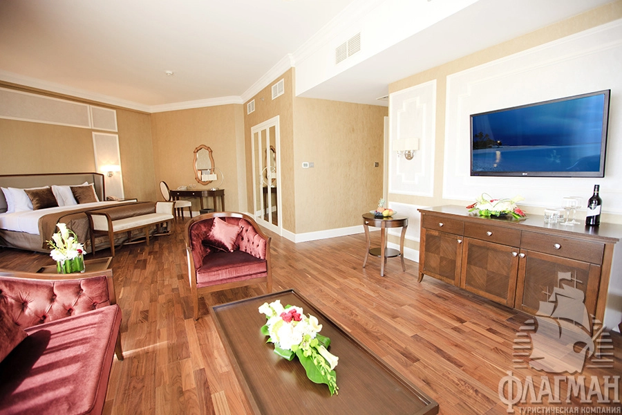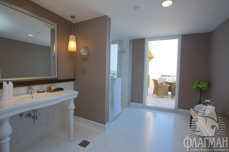 - 14 Senior Suite (107–152 м2, 3 спальни, гостиная, есть межкомнатная дверь, с видом на море, терраса (шезлонги и зонты), 3 кровати king-size, макс. 6+2 чел., 4 ванные комнаты: душевая кабина + ванна; личный дворецкий 24 часа – по запросу),