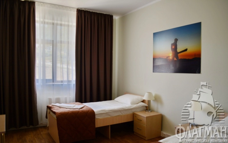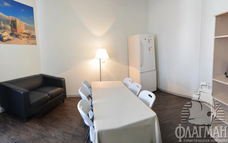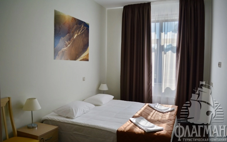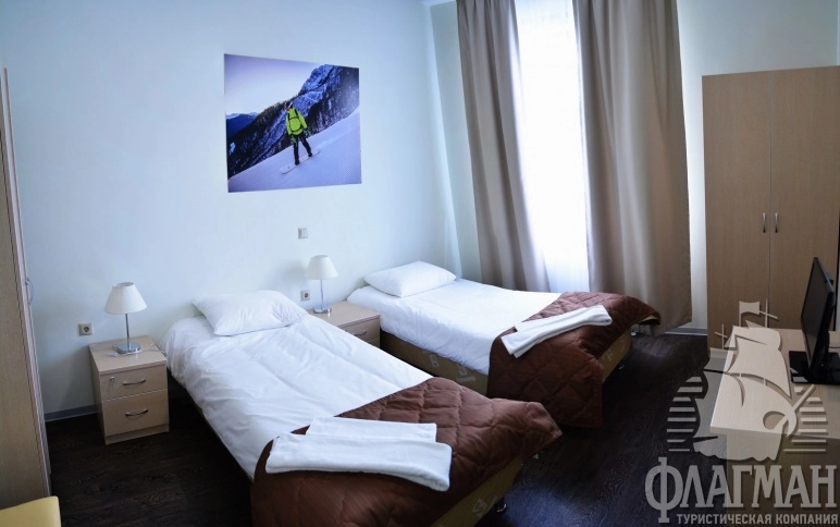 - 7 Company, (4-ех комнатные апартаменты) (82 м2, макс. 6 человек) Номер состоит из четырёх комнат, из которых три спальни, гостиная, прихожая с местом для хранения лыж, два санузла с душем. В спальне: одна большая или две раздельные кровати. В гостиной: мягкая мебель (диван), стол шесть стульев, холодильник, микроволновая печь, электрический чайник, ТВ, телефон.