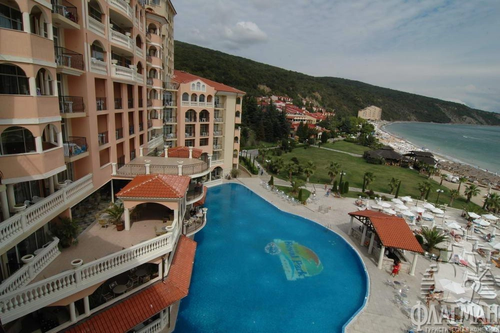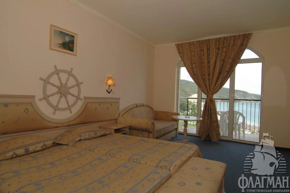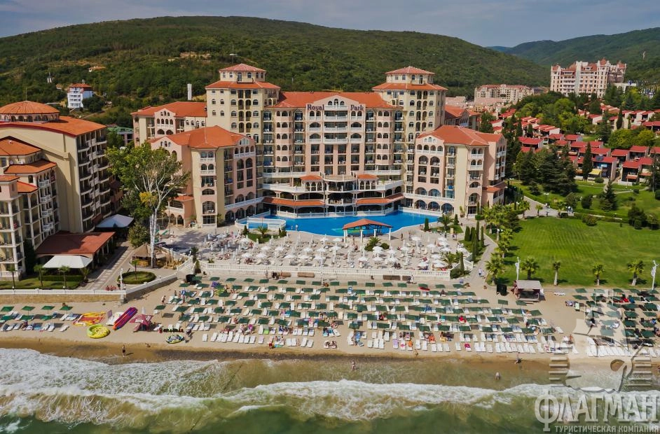 В курортном комплексе Елените, в 40км от аэропорта города Бургас, в 12 км от курорта Солнечный Берег, на самом берегу моря.