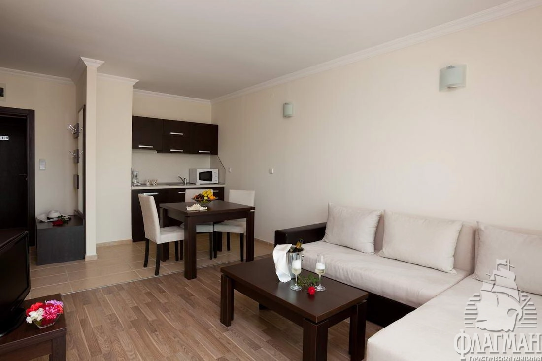 - 74 apartment (спальня и гостиная с раскладным диваном, со смежной дверью между ними, ванная комната с душевой кабиной, макс. 2+2 чел., 65 м2),