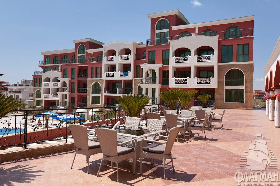 В самом начале курортного комплекса Святой Влас, в 40 км от аэропорта города Бургас, в 95 км от города Варна, в 4 км от центра курорта и в 300 м от пляжа.