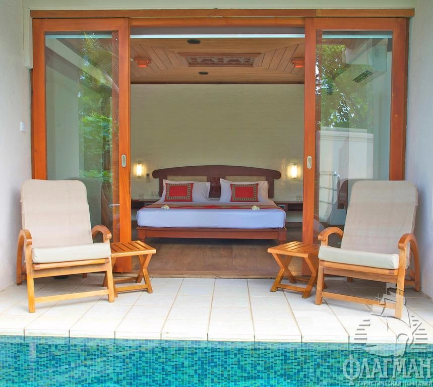 8 Deluxe Suite with Pool (81 м2, макс. 2 чел.). Номера аналогичны номерам категории Deluxe Suite, дополнительно – собственный бассейн (7 м) в саду с лежаками. В двух номерах кровати twin.