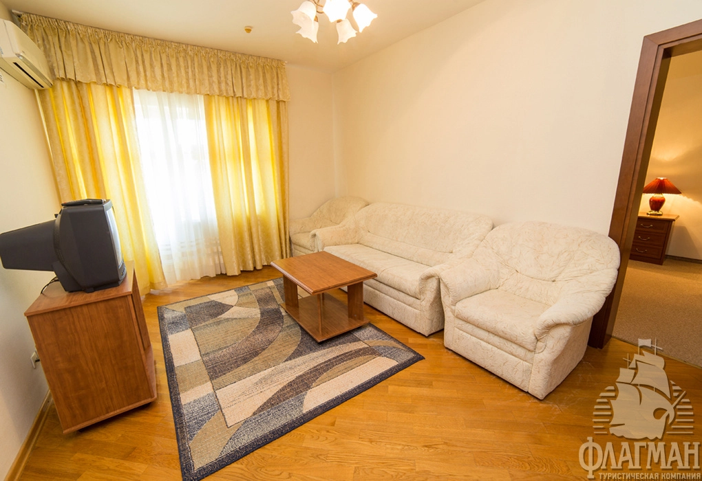 - 4-местный 3-комнатный люкс (макс. 4+3 чел., 40 кв. м, телевизор, сплит-система, ванна, туалет, холодильник, балкон, 2-спальная кровать, две 1-спальные кровати). Доп. место - еврораскладушка, может быть установлена без ограничения по возрасту.