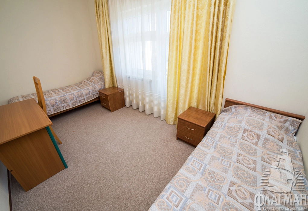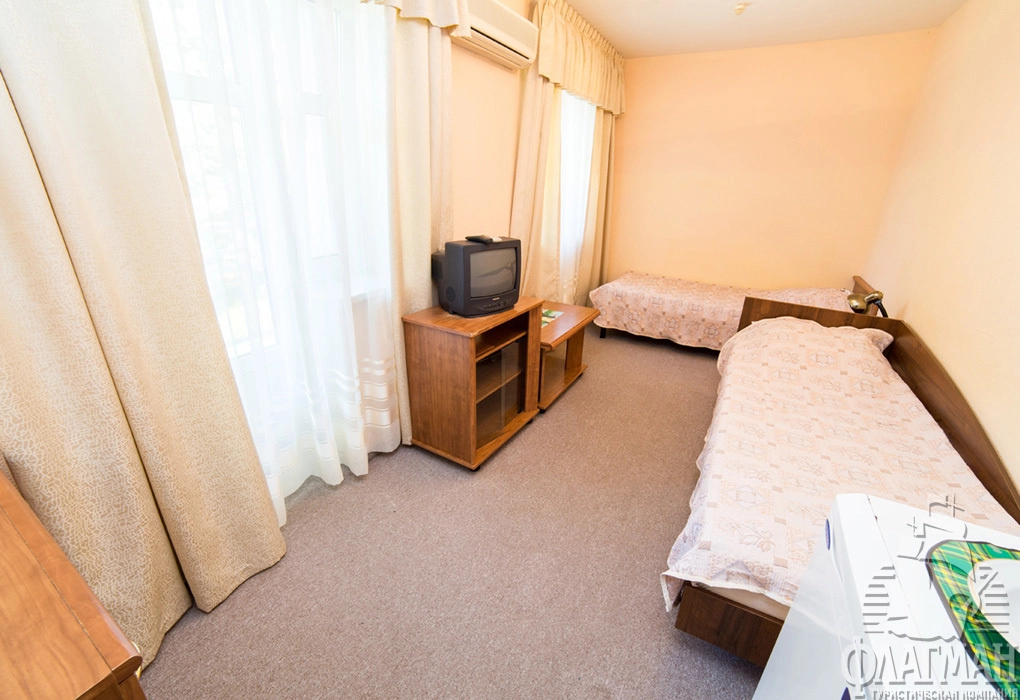 - 2-местный стандартный номер (макс. 2+1 чел., 14 кв. м, телевизор, сплит-система, душ, туалет, холодильник, балкон, 1-спальные кровати). Доп. место - еврораскладушка, может быть установлена без ограничения по возрасту.