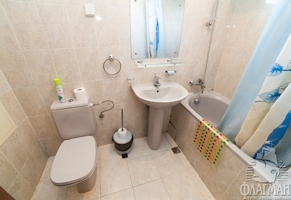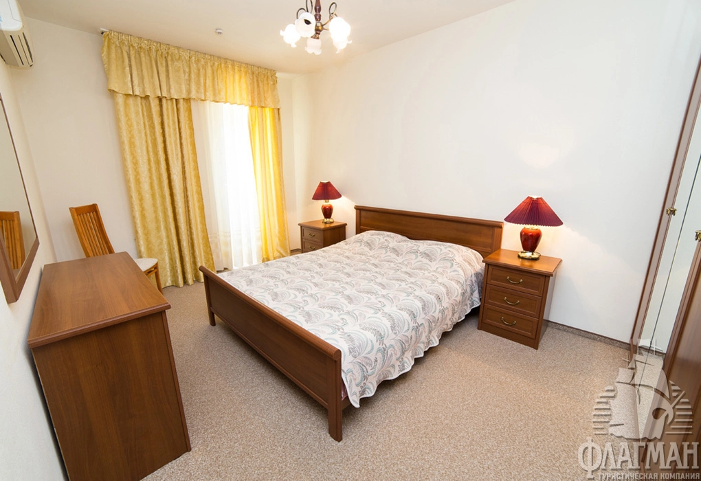 - 3-местный 2-комнатный стандартный номер (макс. 3+2 чел., 30 кв. м, телевизор, сплит-система, ванна, туалет, холодильник, балкон, 2-спальная и 1-спальная кровати). Доп. место - еврораскладушка, может быть установлена без ограничения по возрасту.
